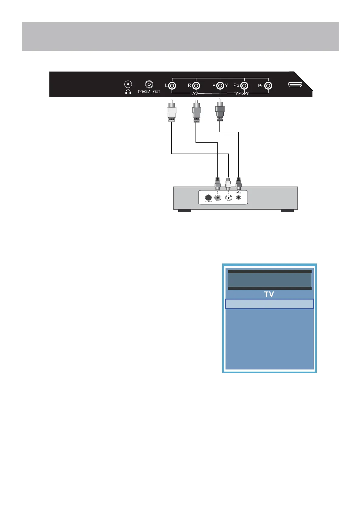 NOTE: The yellow A/V cable plugs into the green input labeled Y/V on the back of the TV
