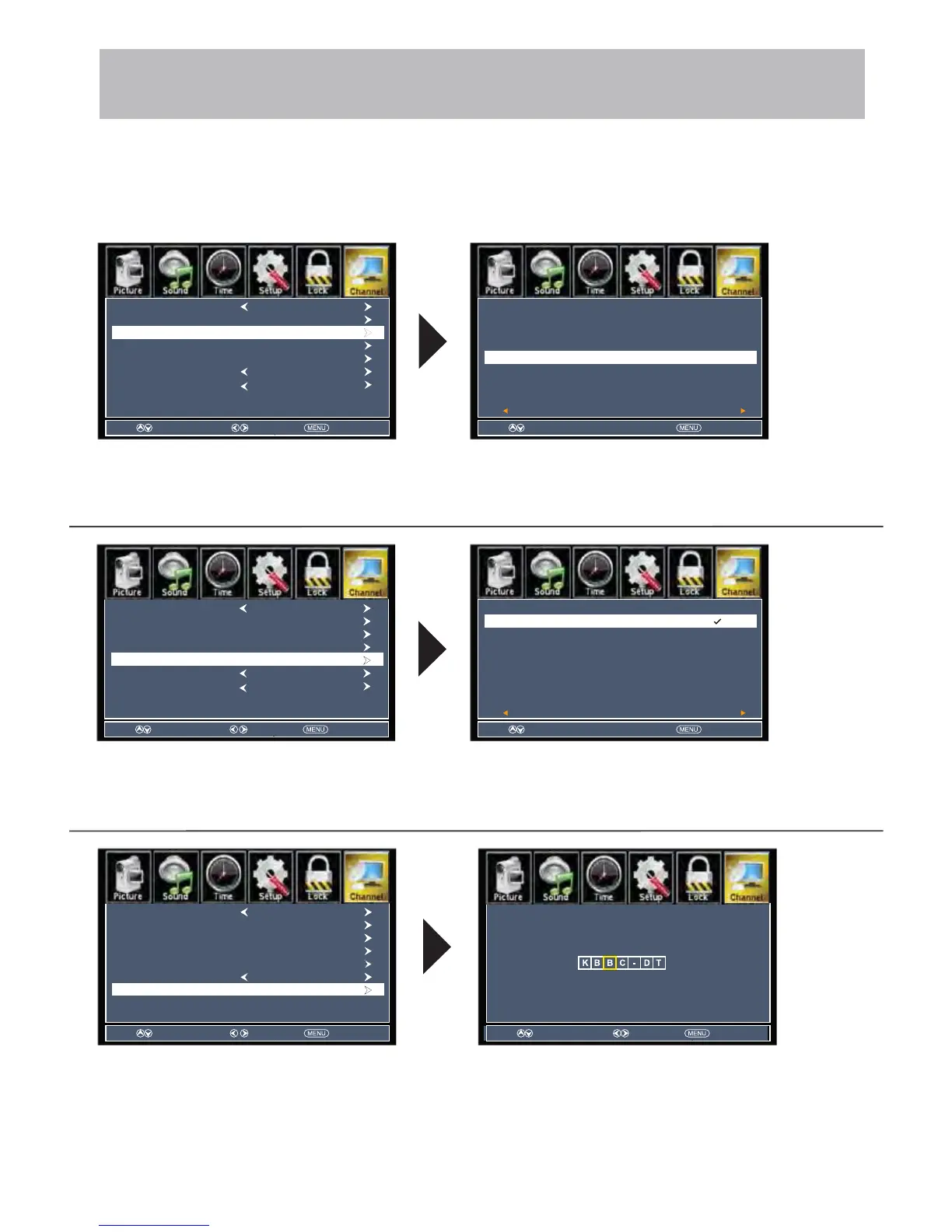 screen menu to re-label a channel. Use the arrow buttons to spell out each letter, number or character. Use
