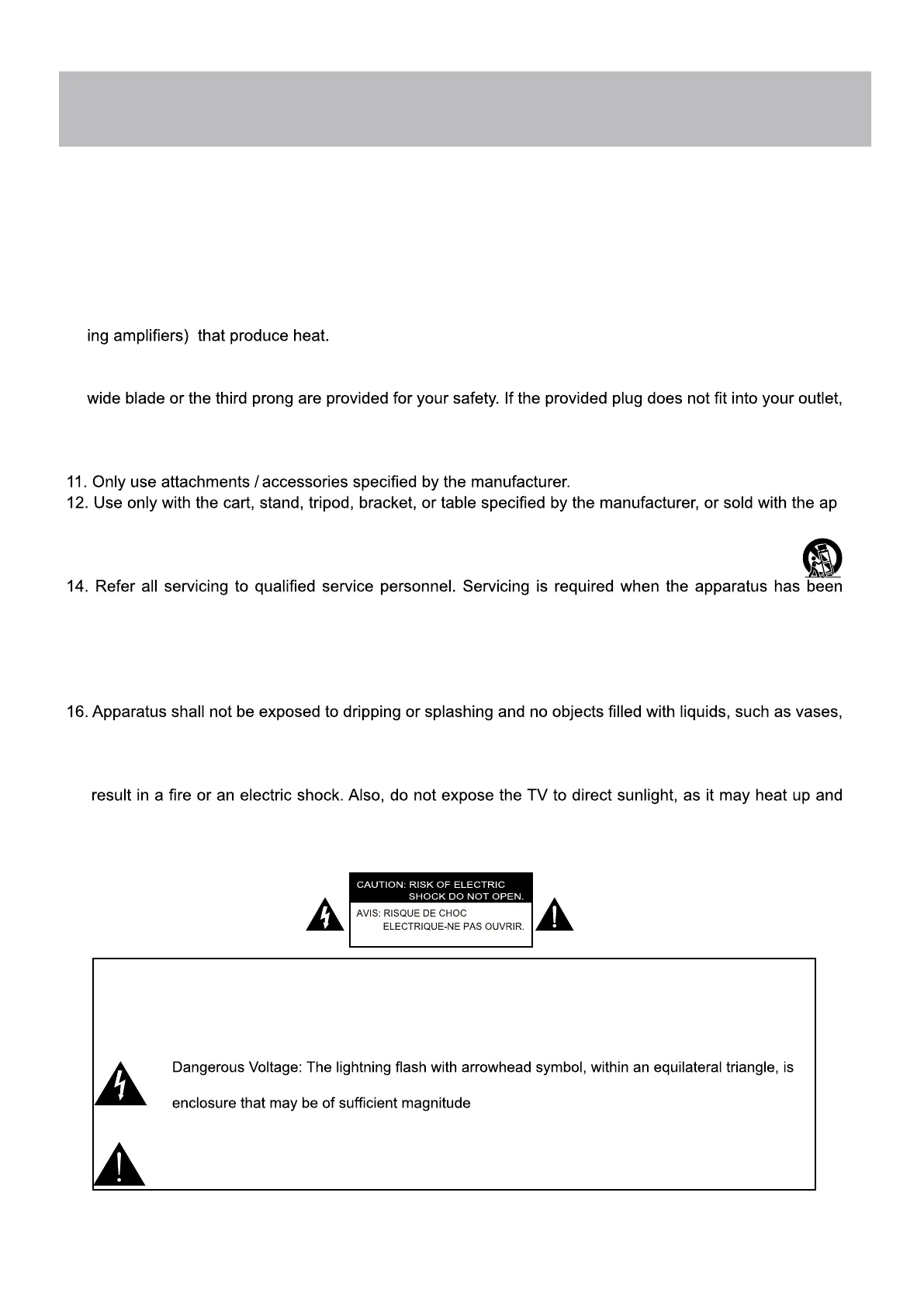 18. Use in outdoors: This TV is not designed for outdoors installation. Do not expose the TV to rain, as it may