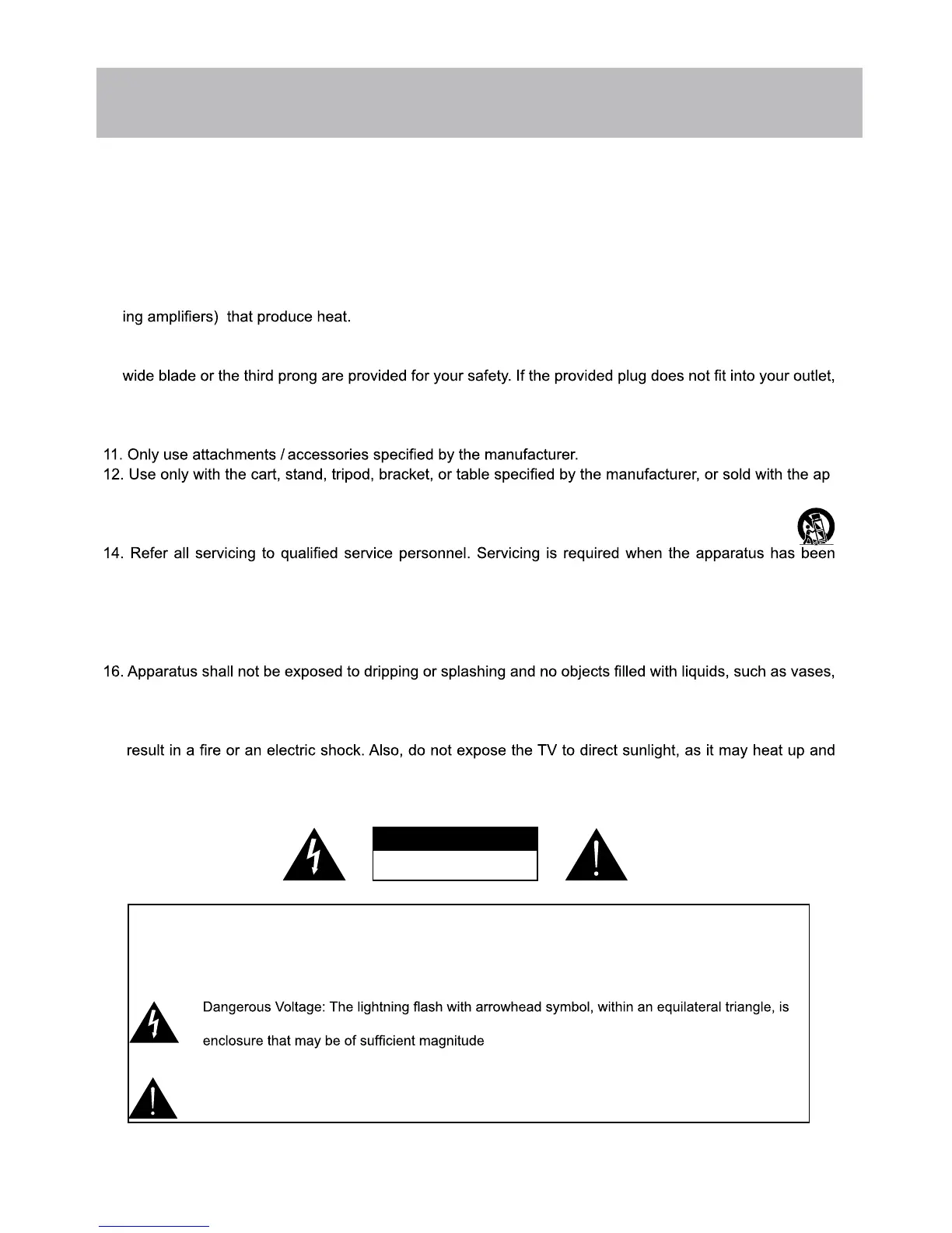 18. Use in outdoors: This TV is not designed for outdoors installation. Do not expose the TV to rain, as it may