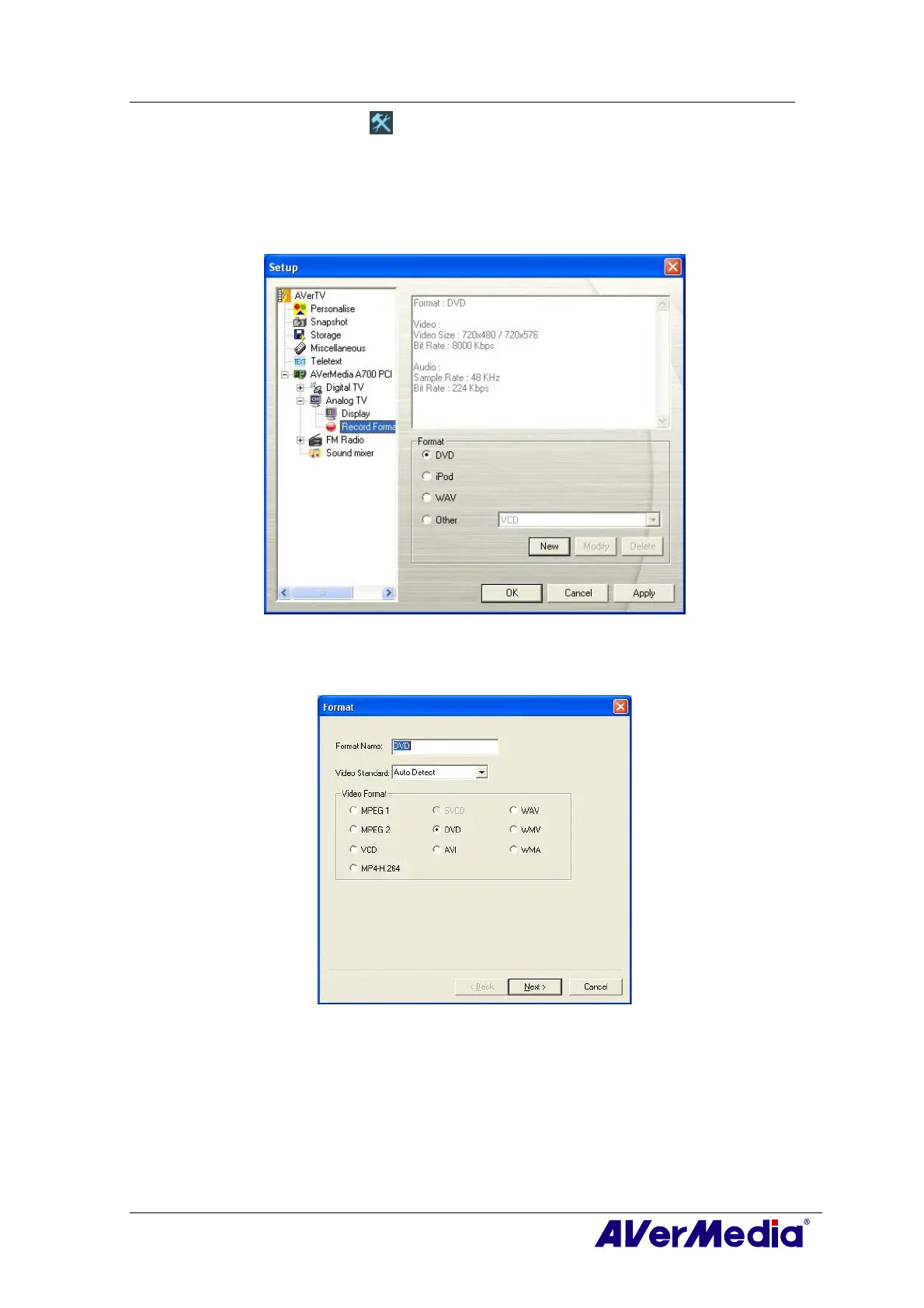 6. In the Video dialog box, you can set the video format and audio format. The setting