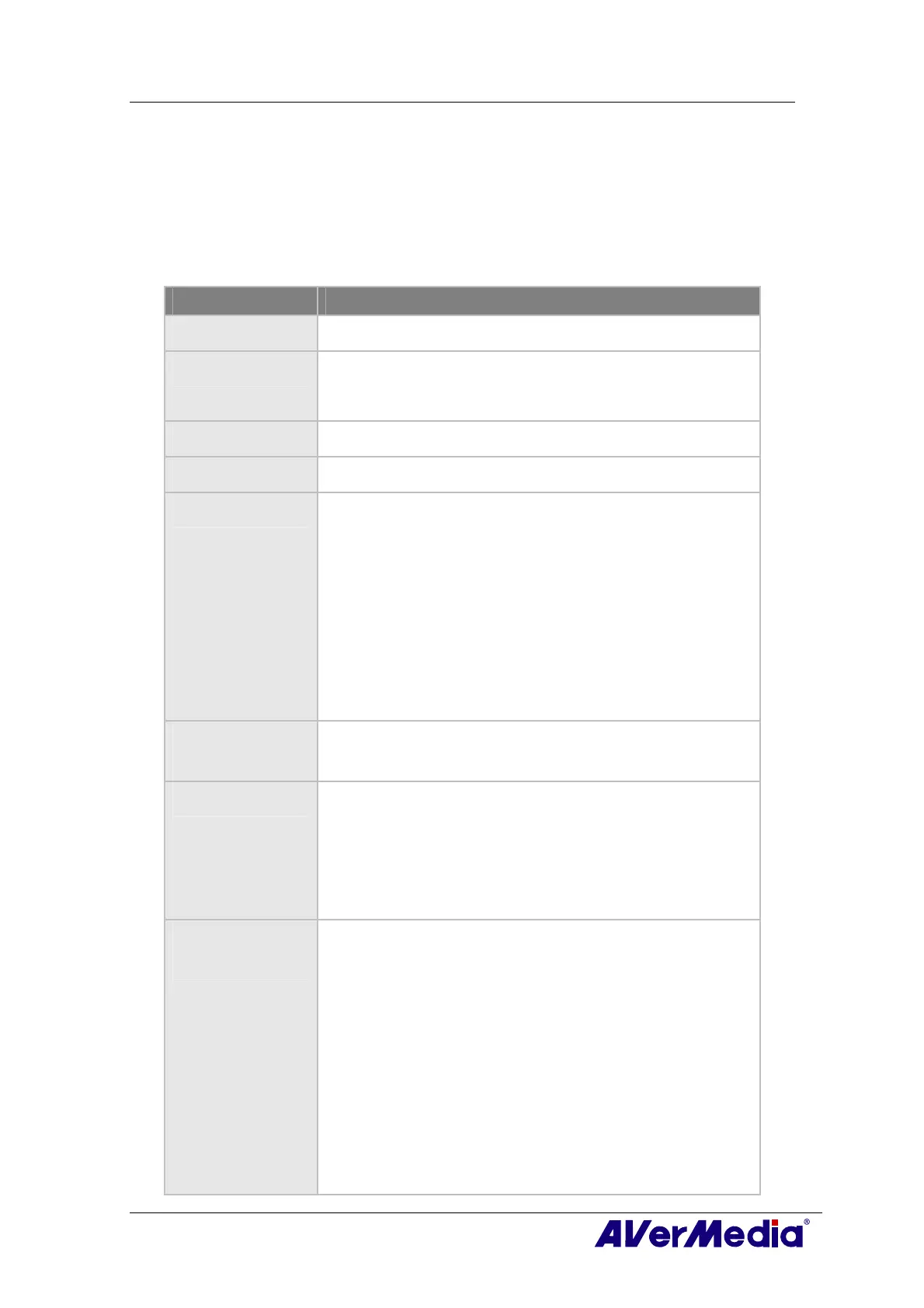 Thanks for purchasing AVerMedia’s product. The table below lists an overview of the