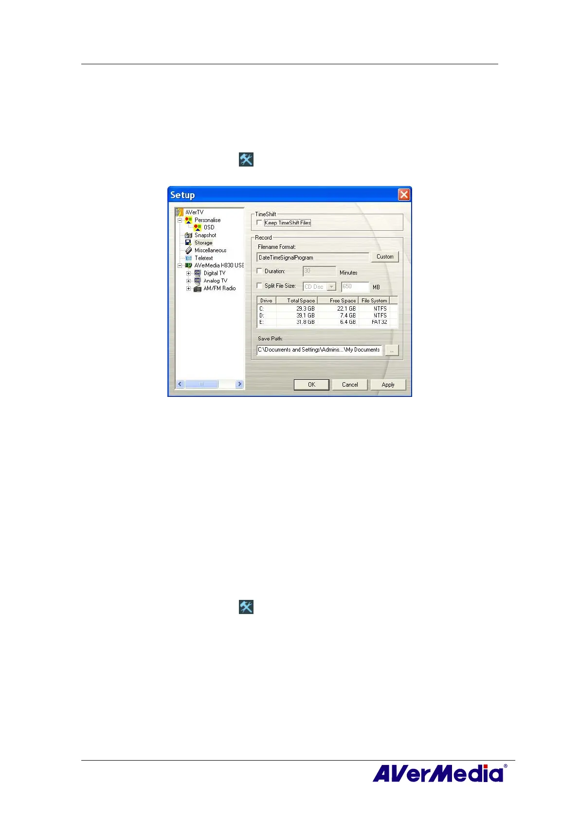 1. Click the Setup button and in the Setup dialog box, click the Storage icon on