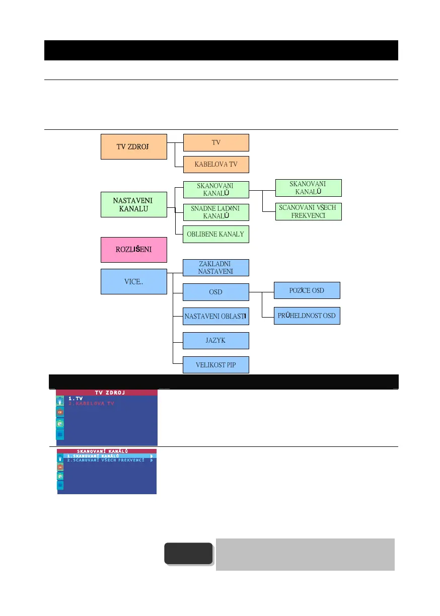 Stiskněte MENU na dálkovém ovladači pro vyvolání a odchod z menu nebo submenu. Použijte CH▲ nebo CH▼