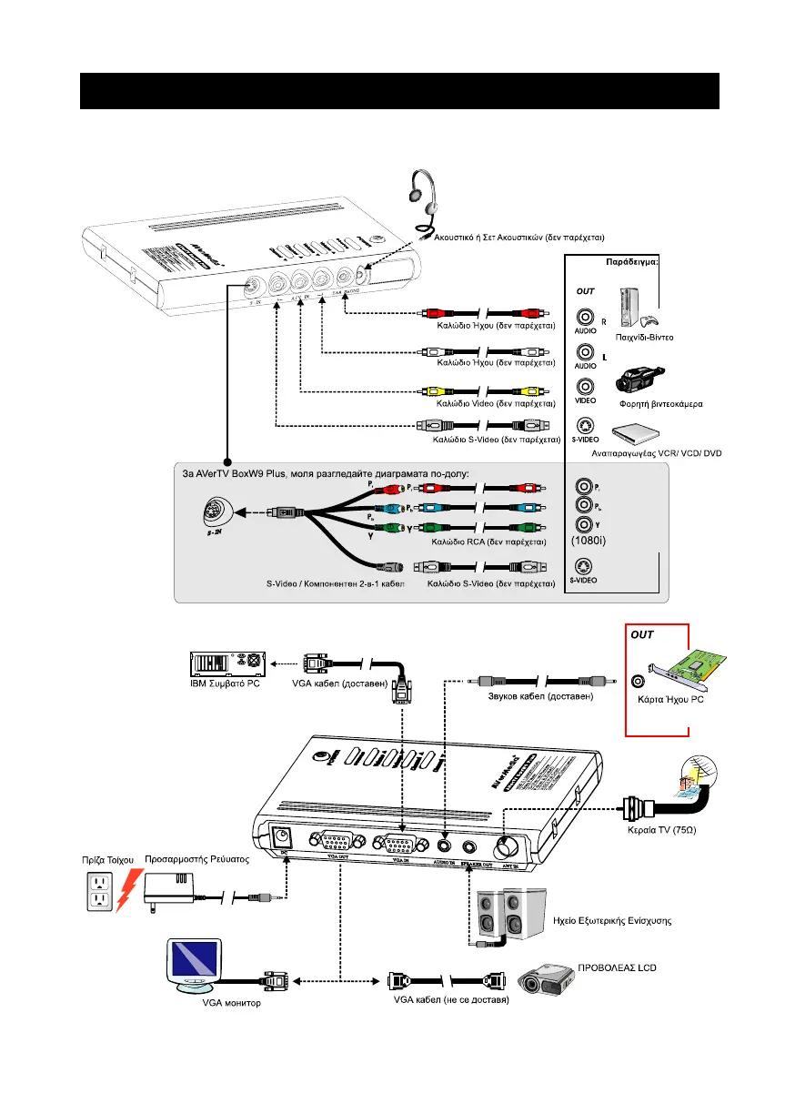 Фигурата по-долу показва съответните кабелни връзки за инсталиране на AVerTV BoxW7 Plus / AVerTV