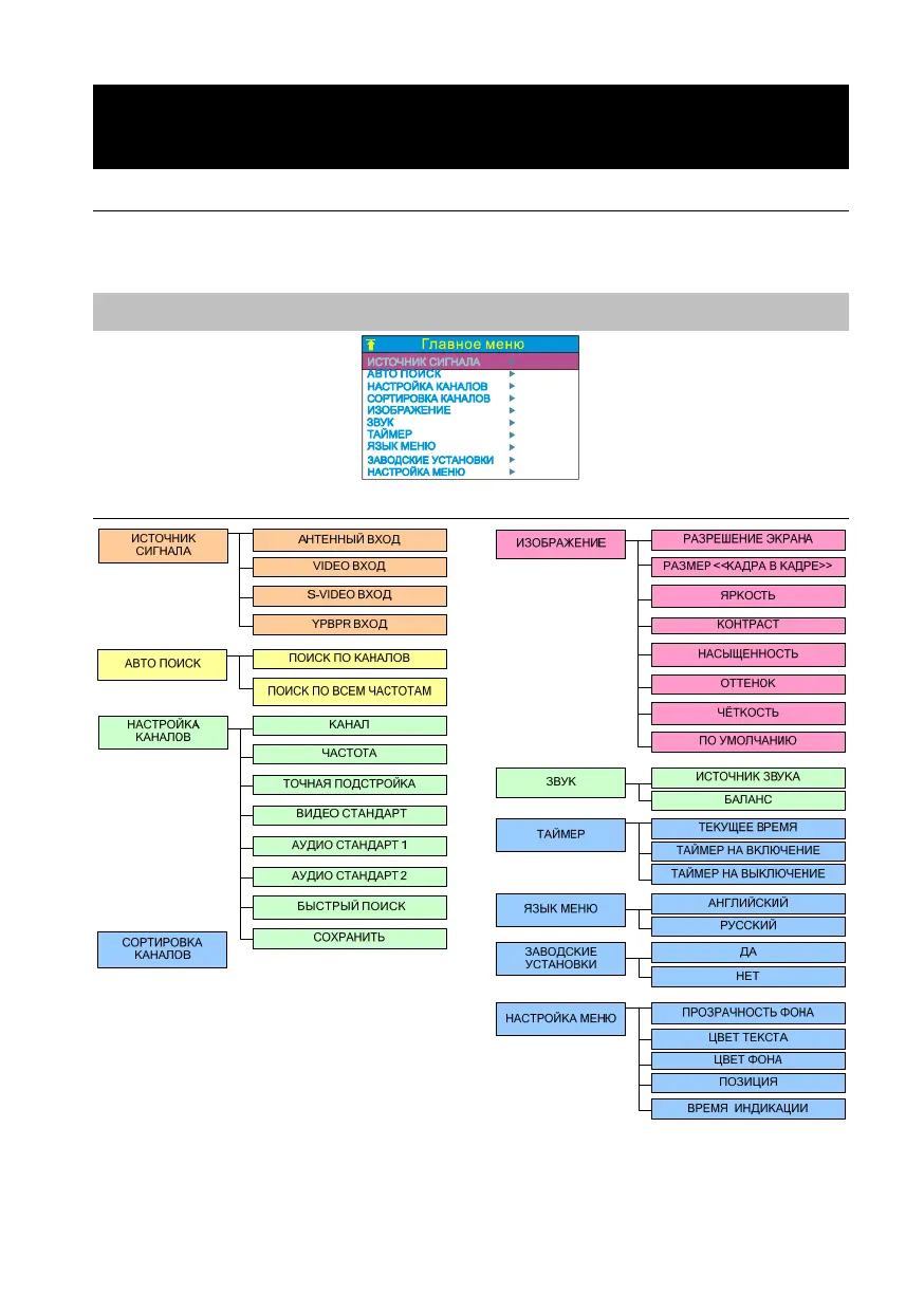 выхода из подменю. Пока ГЛАВНОЕ МЕНЮ находится на экране, кнопками CH▲ или CH▼ можно выбрать