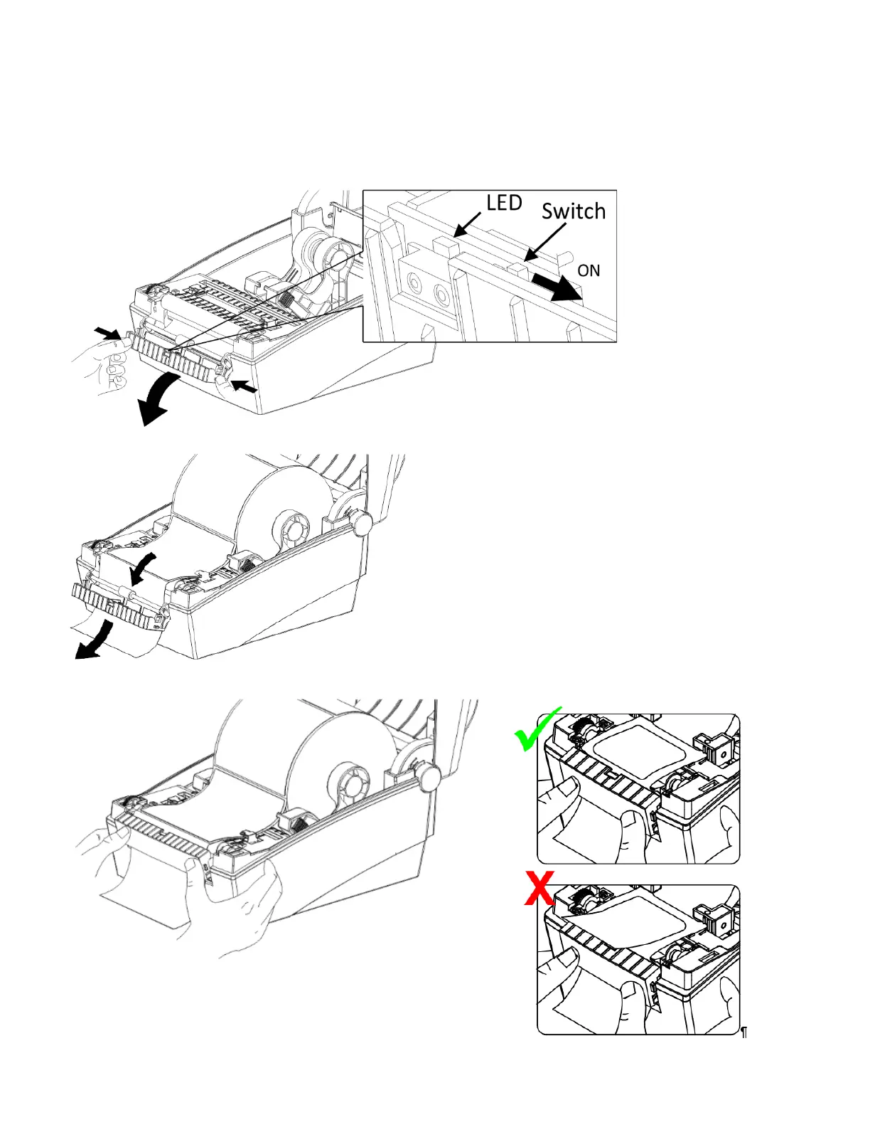 2. Open the peel cover, set the peel mode switch to ON. Make sure the LED is on.