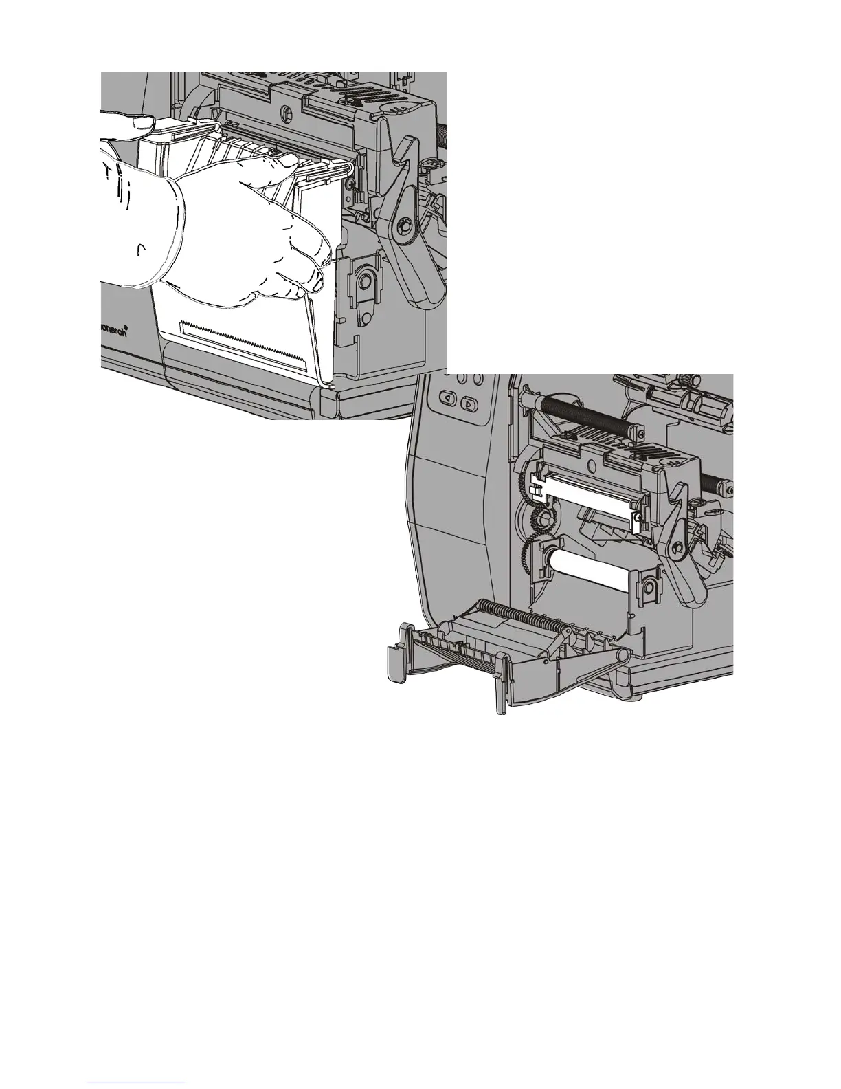 10. Press down on the exit cover tabs to open the exit cover on the front of the printer.