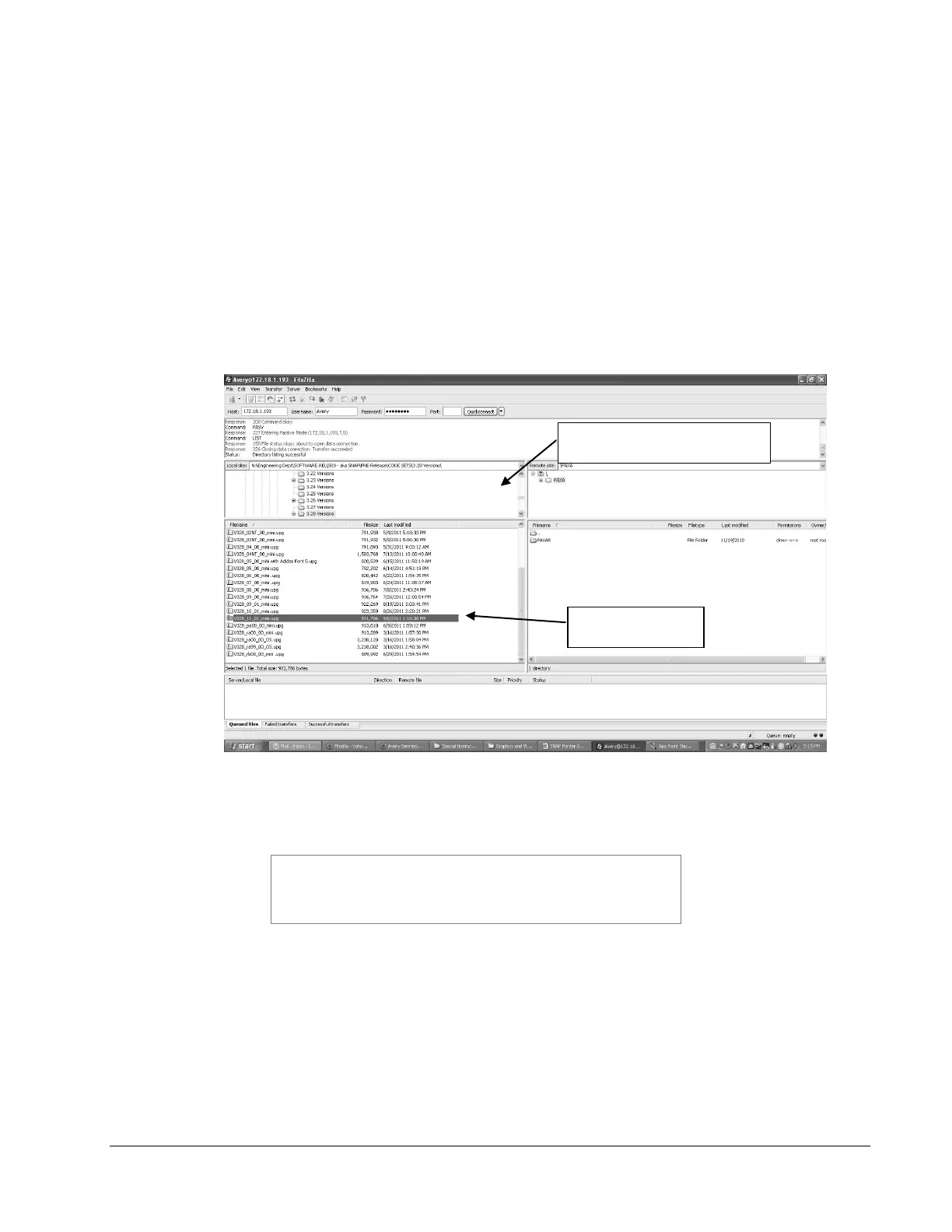 5. The screen below shows Filezilla ready to transfer the upgrade file to the printer.