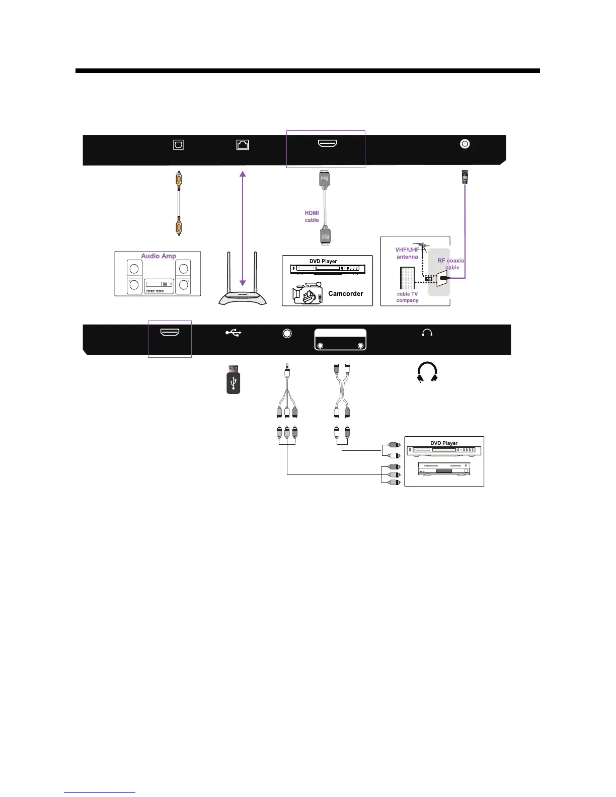 4. RF: Connect to the antenna(75Ω VHF/UHF) socket with the RF coaxial cable.