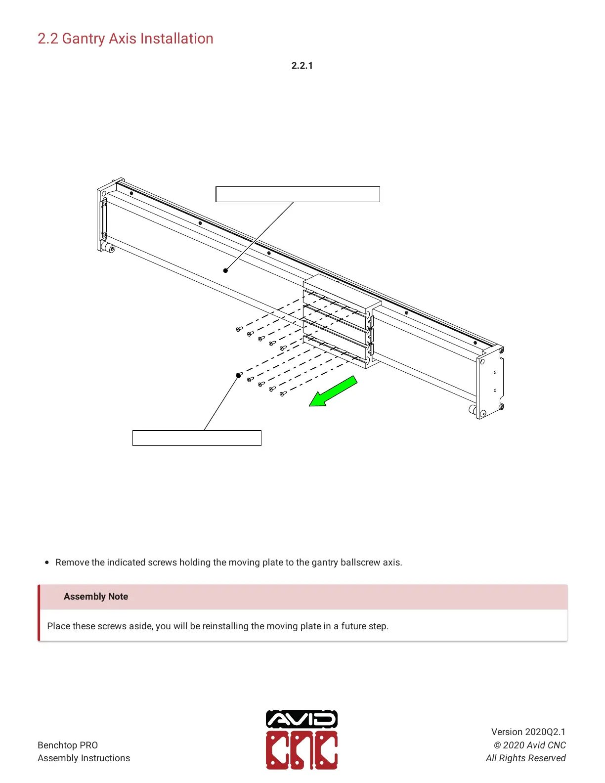 Remove the indicated screws holding the moving plate to the gantry ballscrew axis.