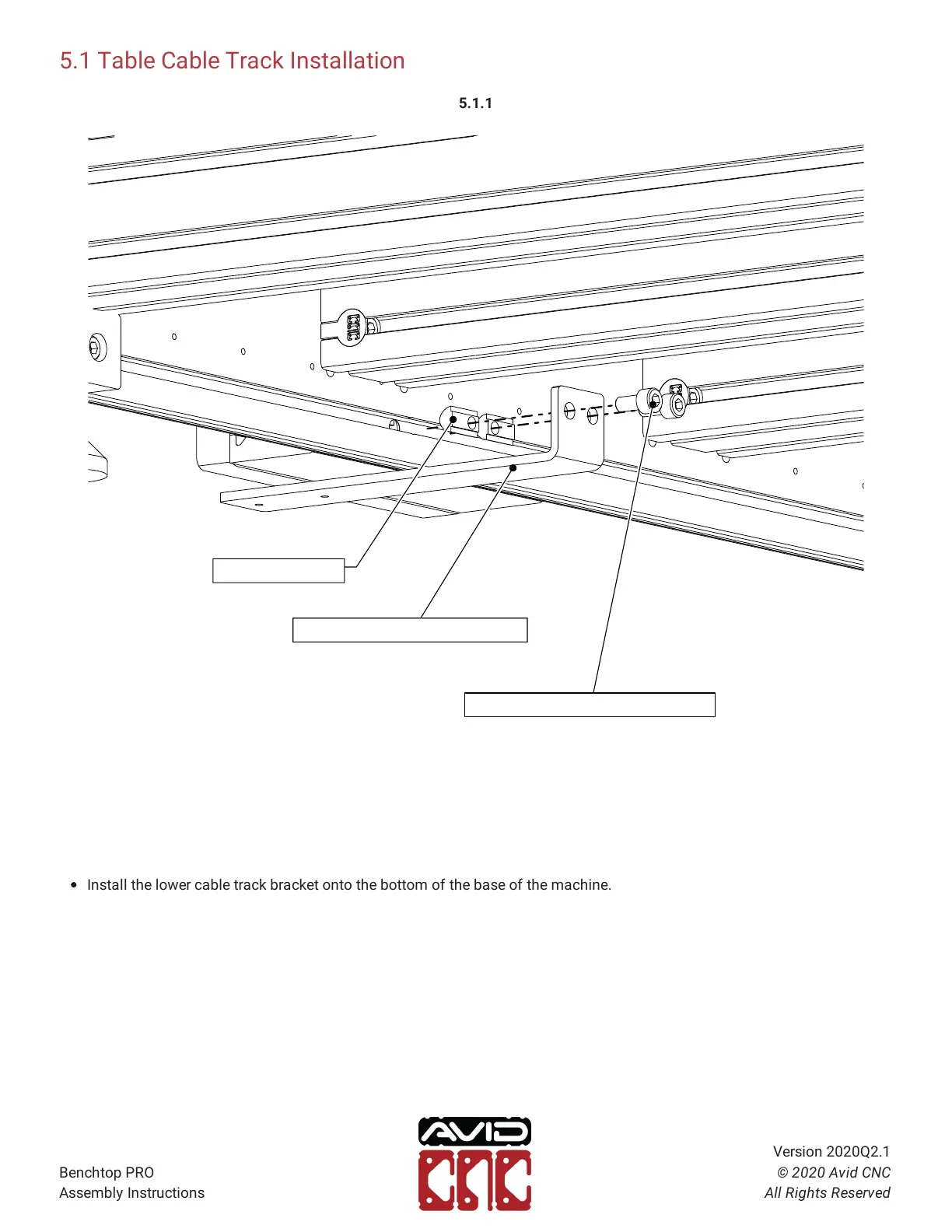 Install the lower cable track bracket onto the bottom of the base of the machine.