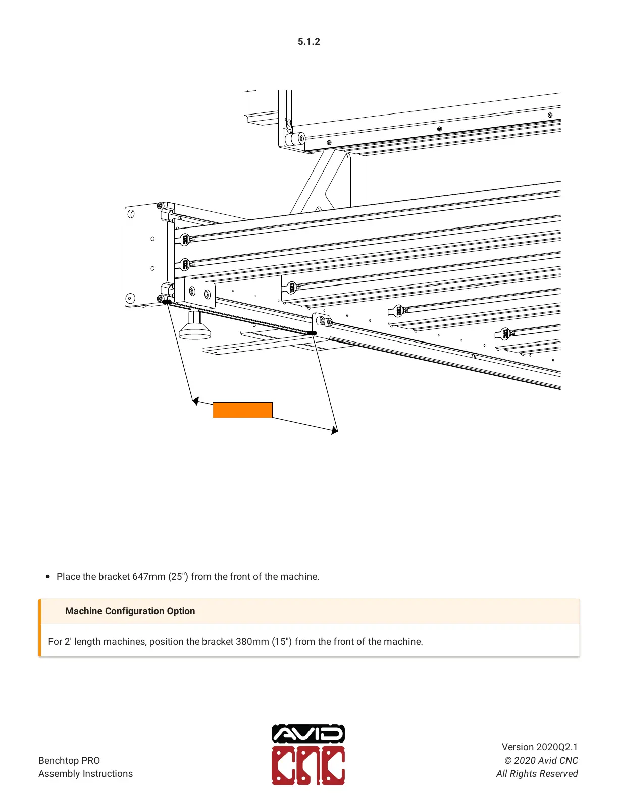 For 2' length machines, position the bracket 380mm (15") from the front of the machine.