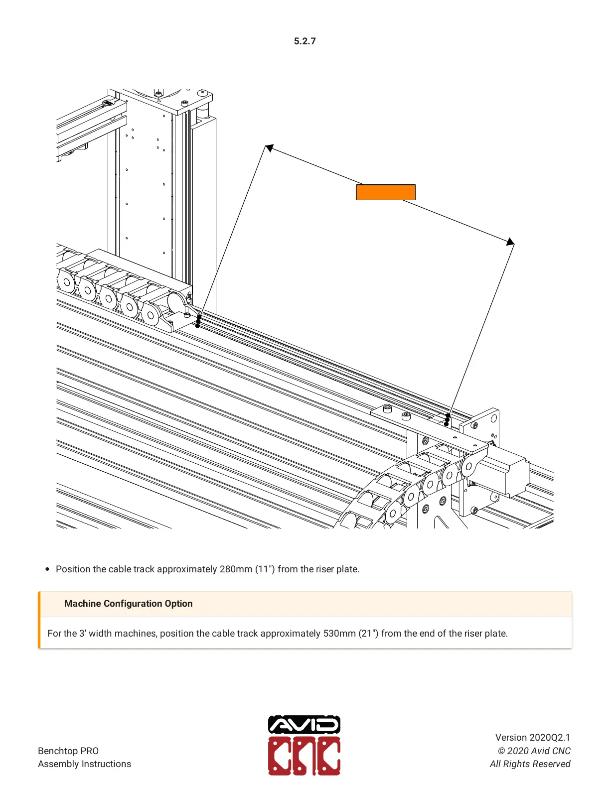 For the 3' width machines, position the cable track approximately 530mm (21") from the end of the riser plate.