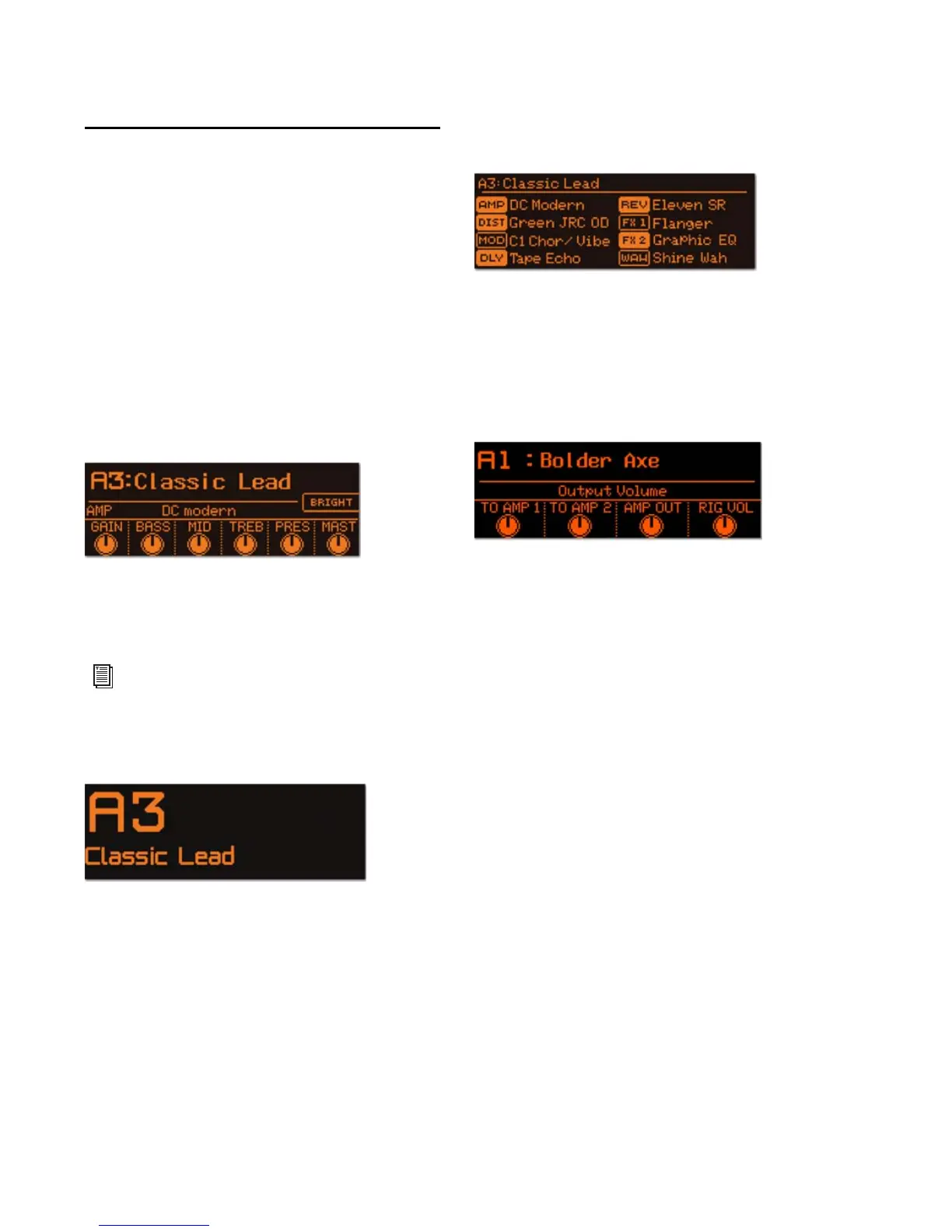 This mode lists the amp, cabinet, and effects