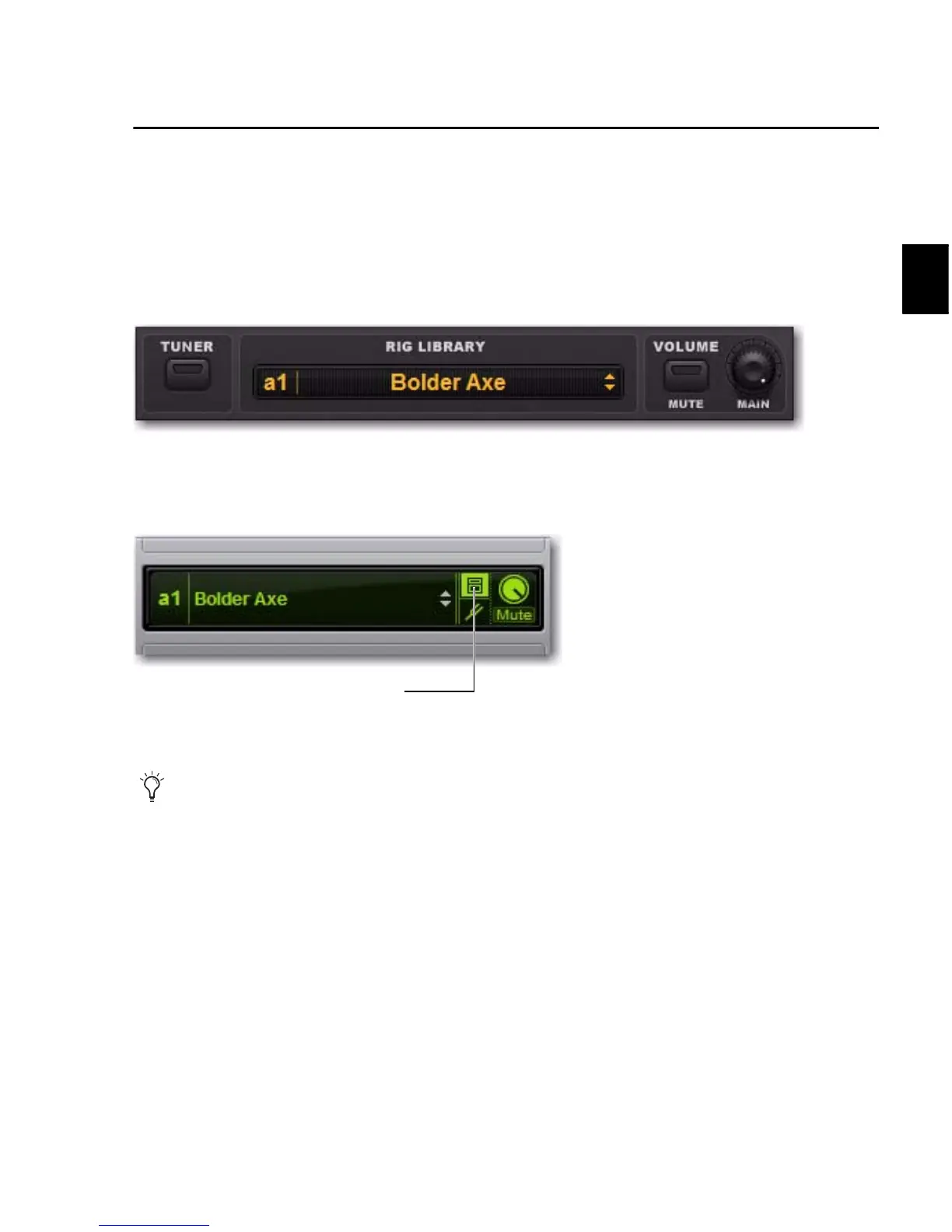 shows the Rig Library menu, basic monitoring controls and a button which activates the Tuner.