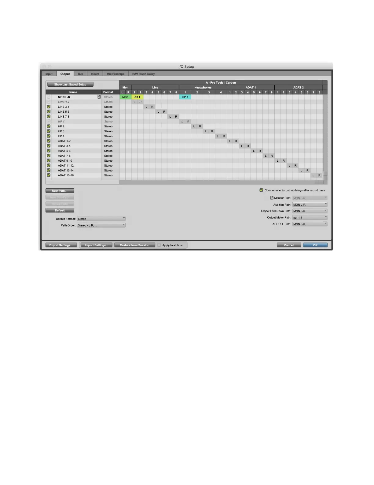 appears color coded in the Output page of the I/O Setup. Each stereo monitor path has a fixed output assignment: