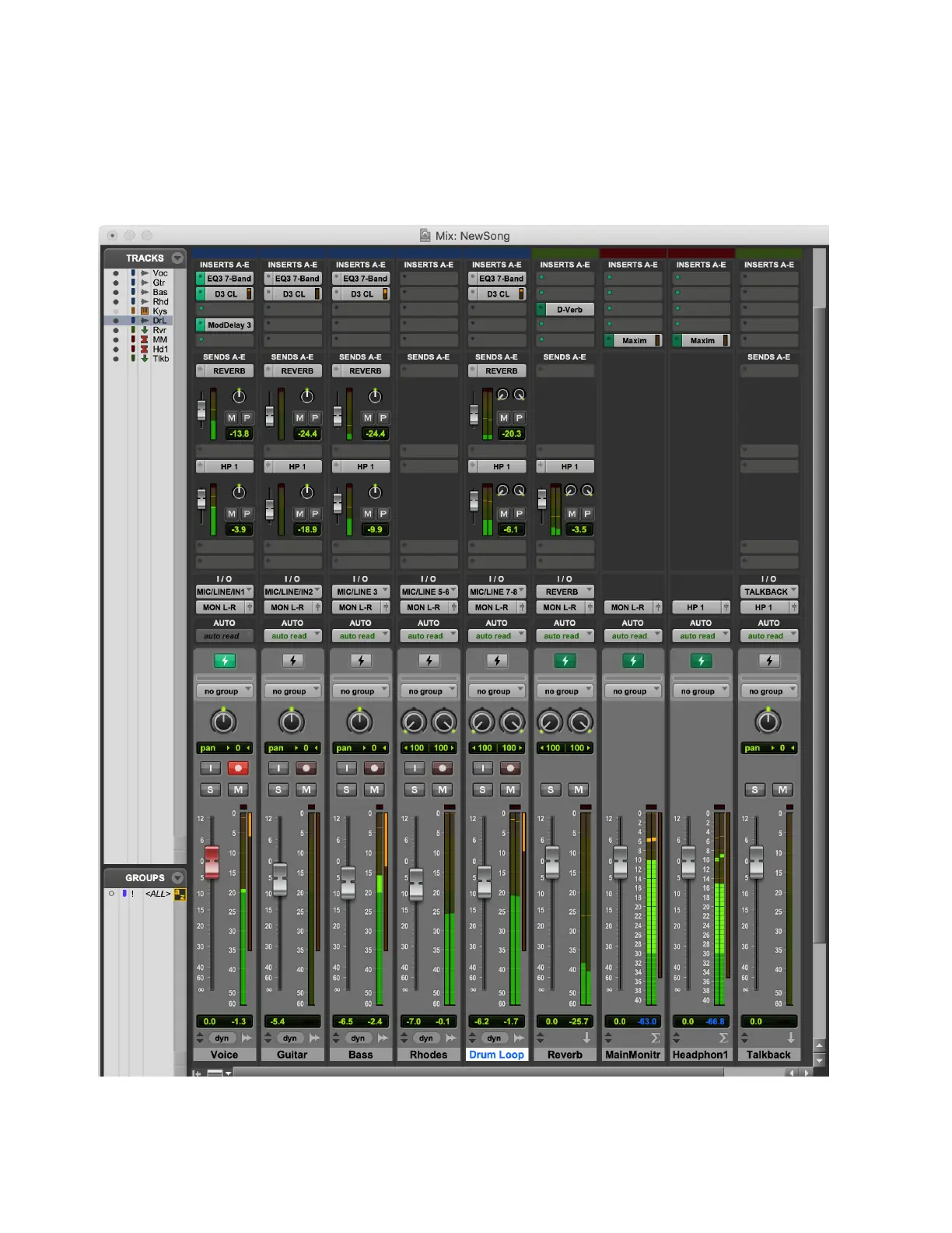 Enable DSP Mode on the vocal track. Notice that all tracks that are part of the signal chain for the vocal track have DSP Mode en-