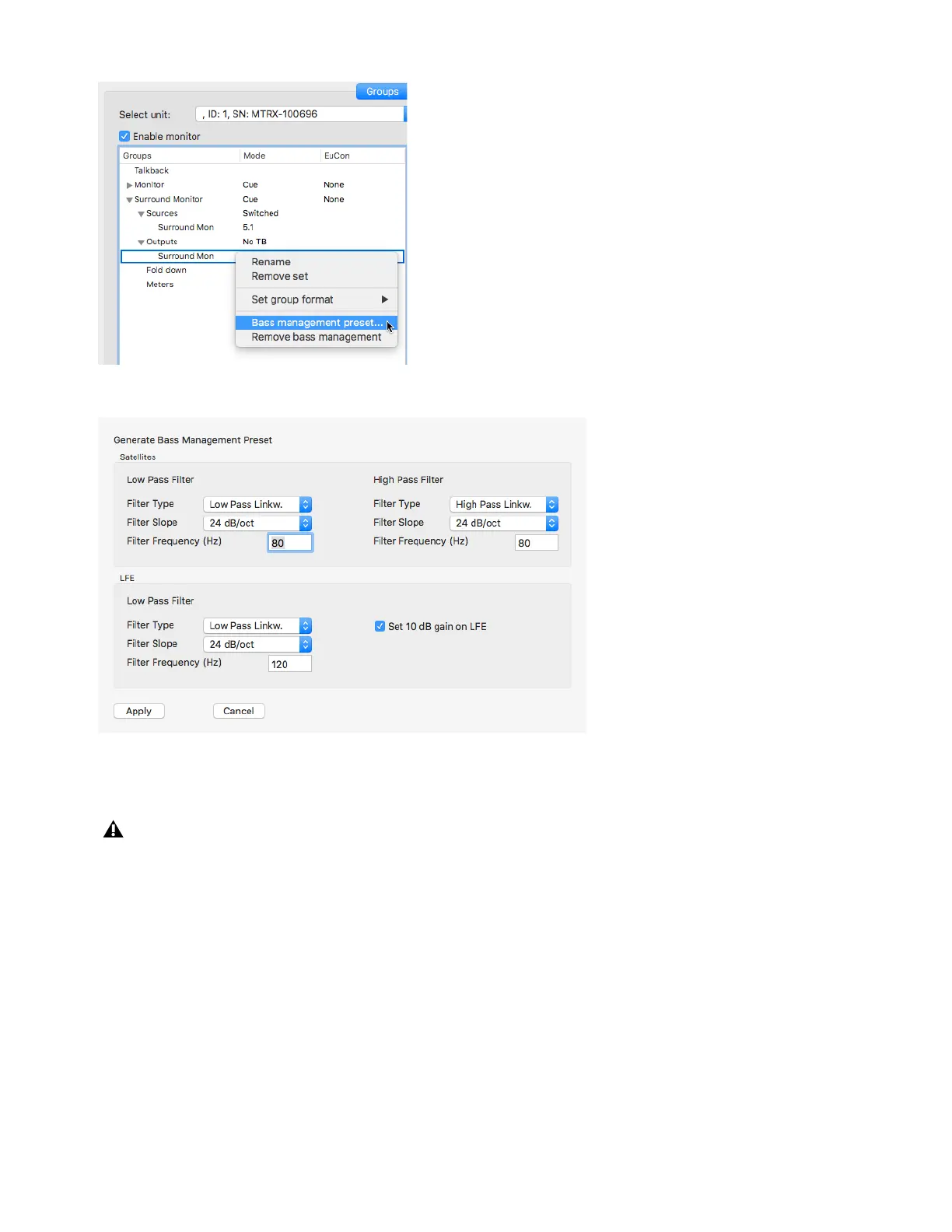 When selecting Bass Management preset an editing window will appear as shown in the following picture.