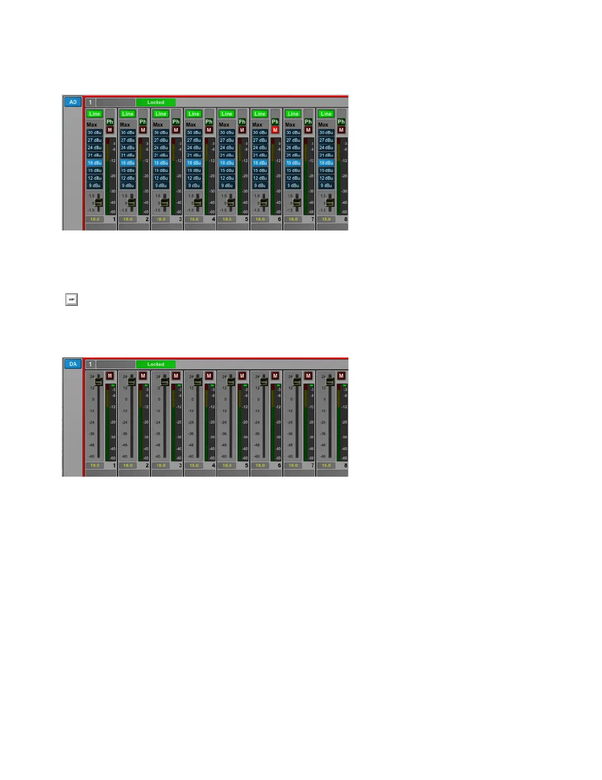 The DA section controls any DA cards in the MTRX. If there are no DA cards in the MTRX, the DA section for that MTRX is empty.