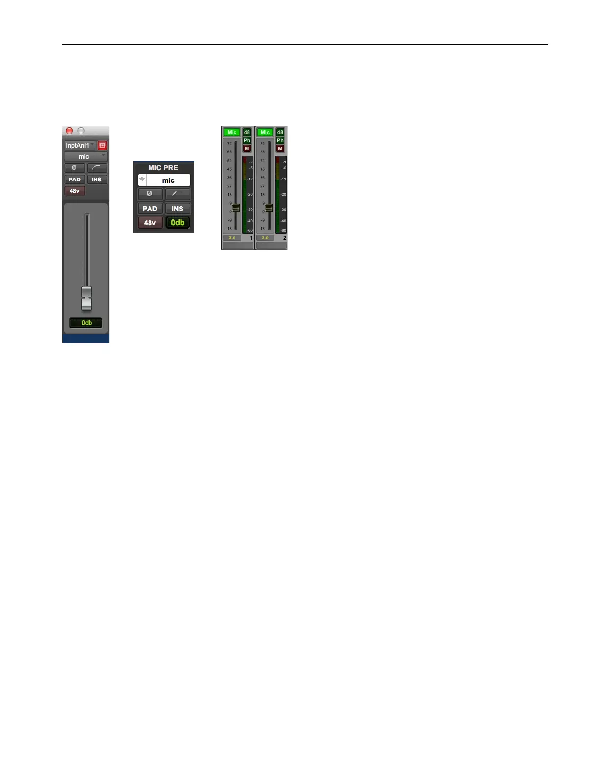 Pro Tools Mic Pre window (left), Pro Tools Mic Pre view (middle), and DADman Channel strip (right)