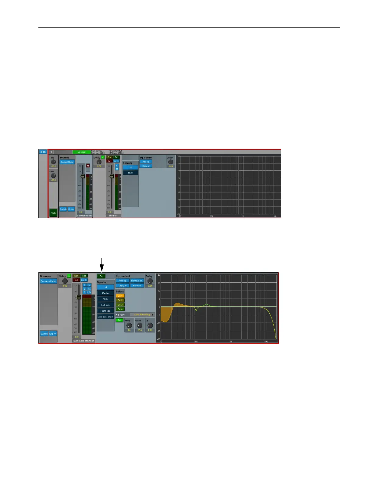 The EQ for all speaker channels in the control room speaker set can be edited and viewed by activating the EQ>> button. Note that the