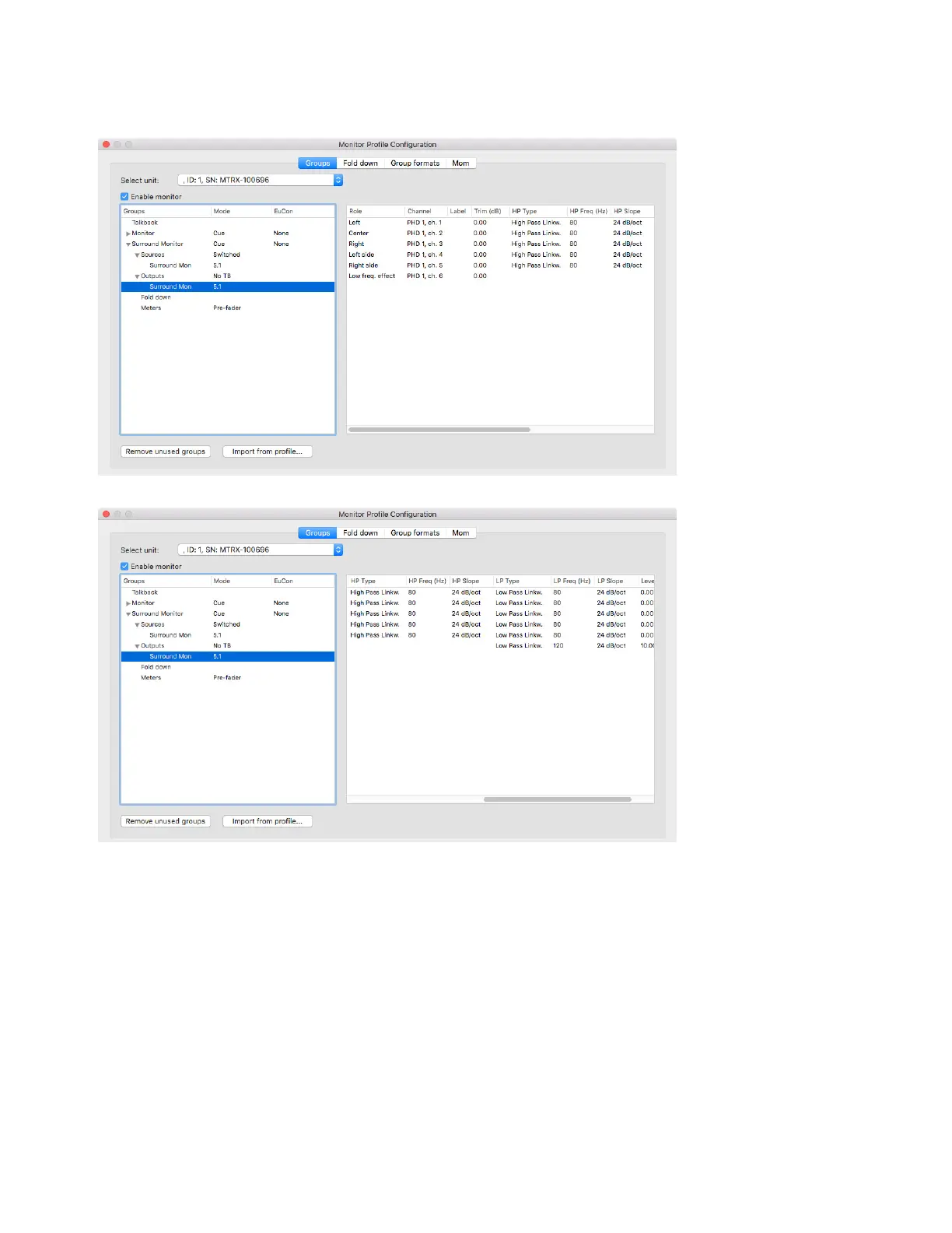 for the actual speaker set. As shown in the following pictures, the Bass Management filter configuration for each speaker channels is vis-