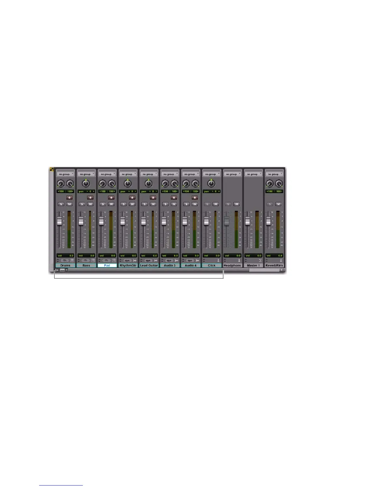3 Verify the Mix window displays a blue-green border around Pro Tools tracks that are currently