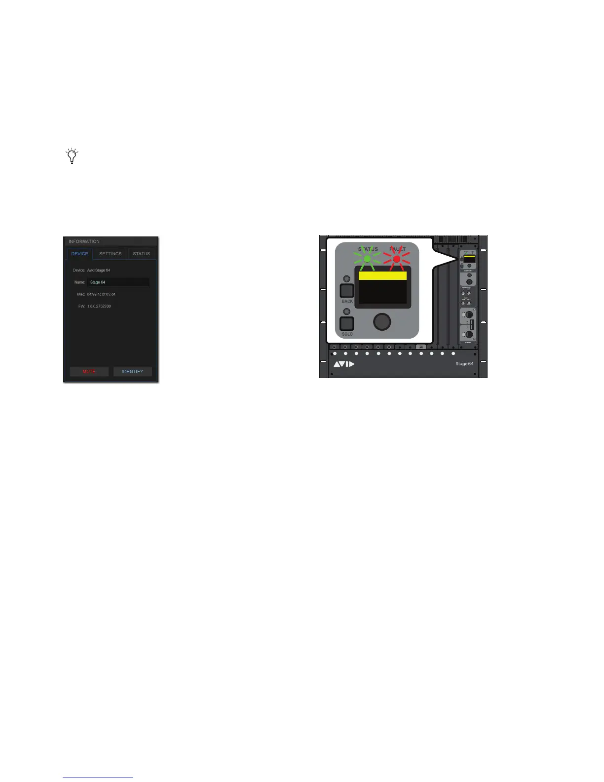 The Identify button (left) and flashing Status and Fault LEDs on the corresponding Stage 64 (right)