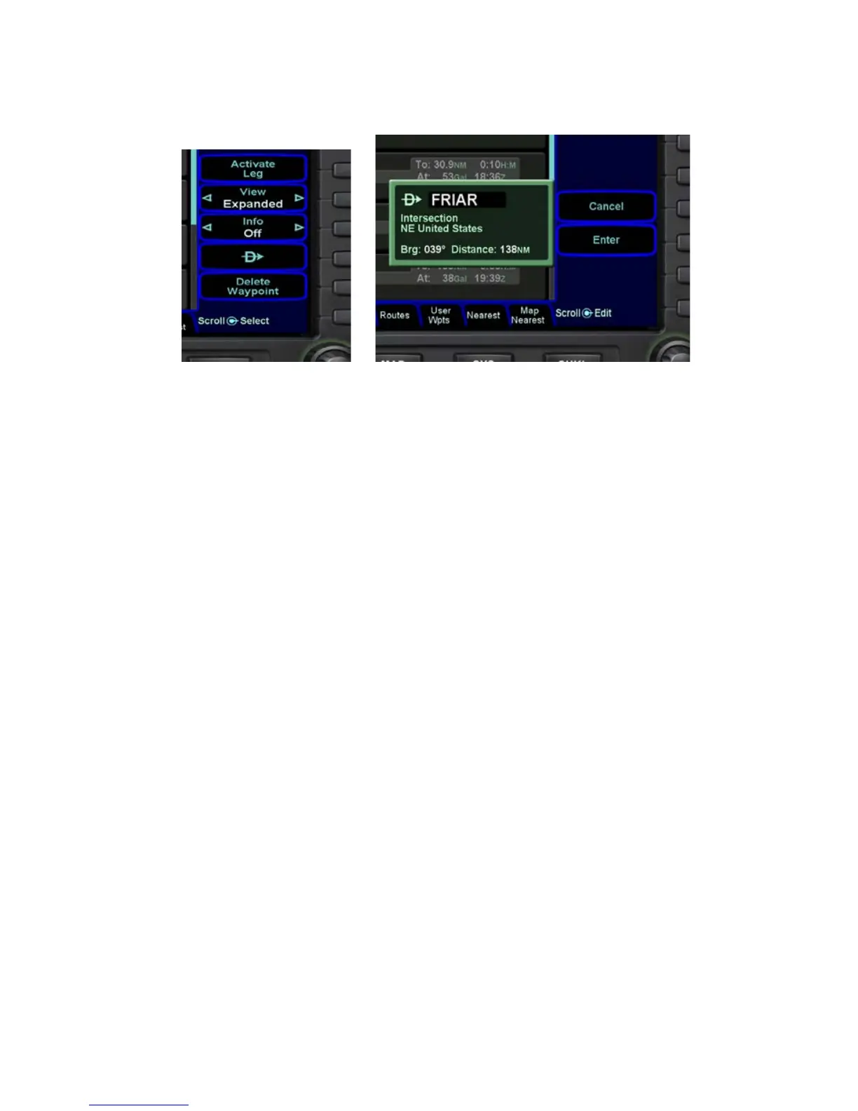 (Flight Plan, Info, User Waypoints, Nearest). Press the