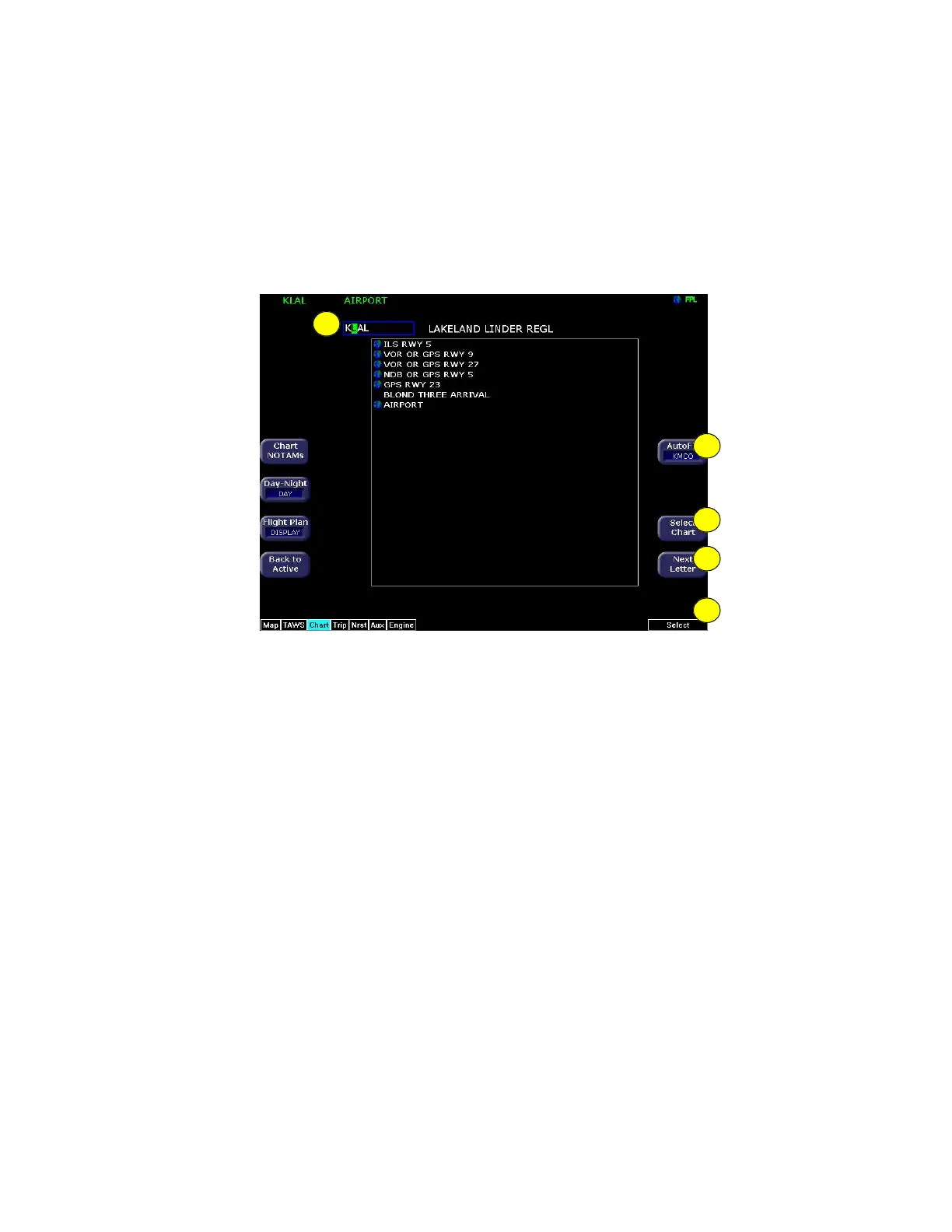 chart list area. The name of the airport in the Airport Entry Field is