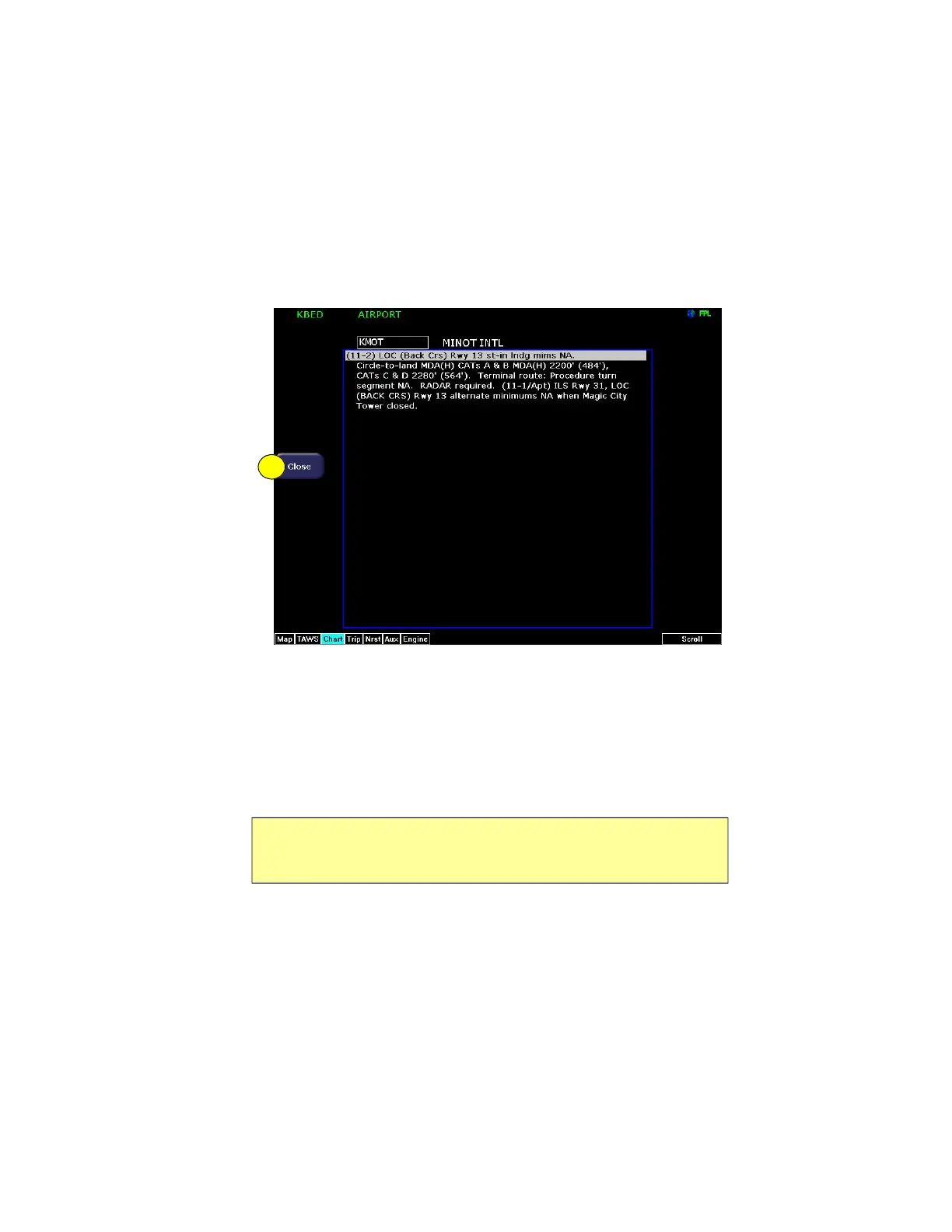1) Close—Press Close to close the Chart NOTAMs window and