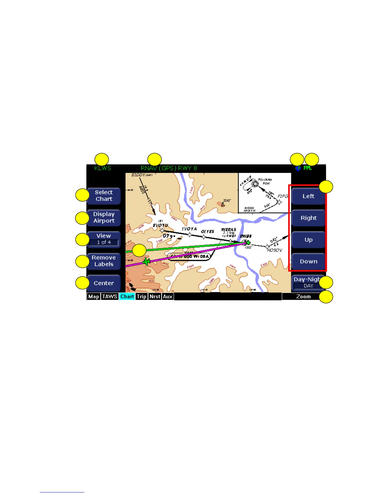 knots. The Chart page shows the airport diagram of the current