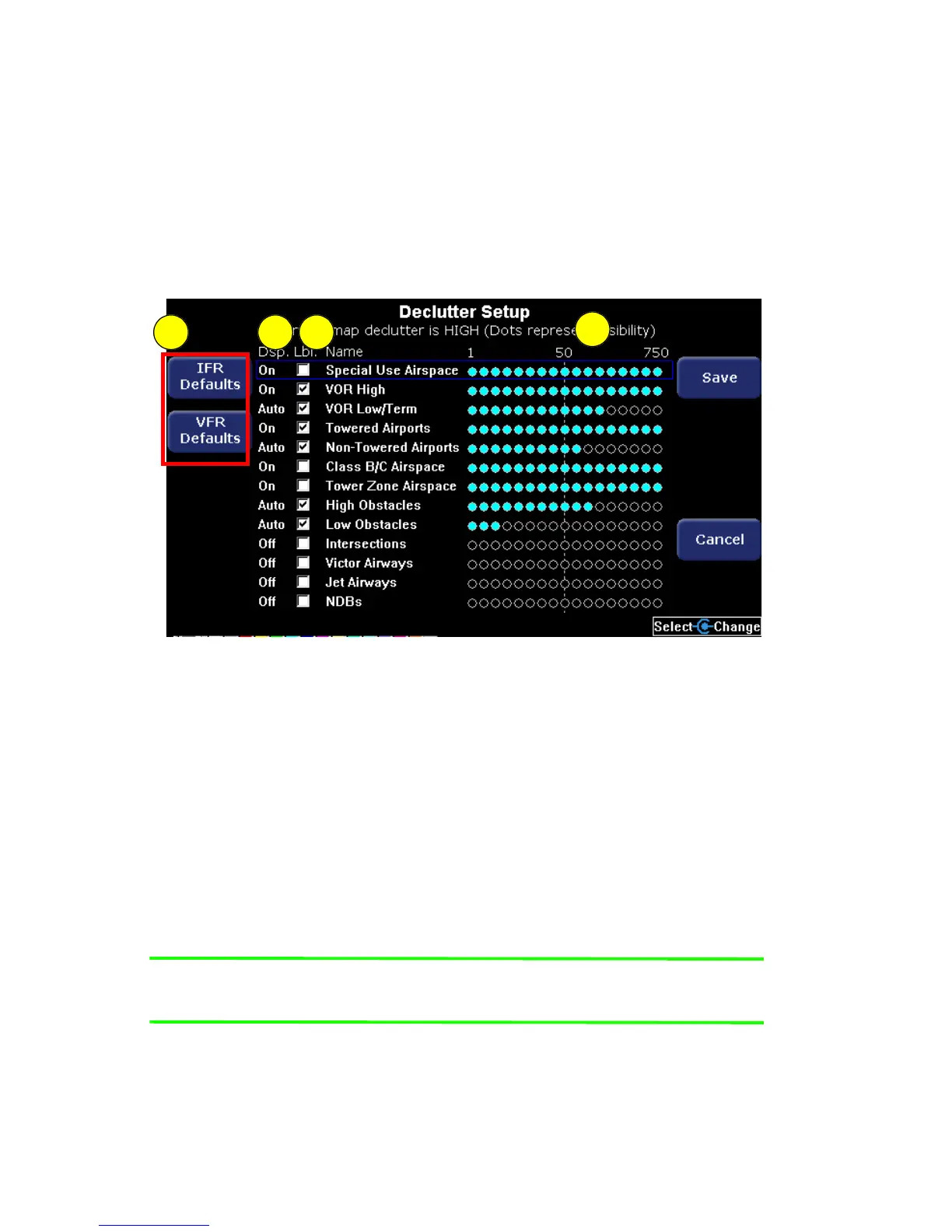 1) IFR & VFR Defaults - Sets the declutter settings to predefined