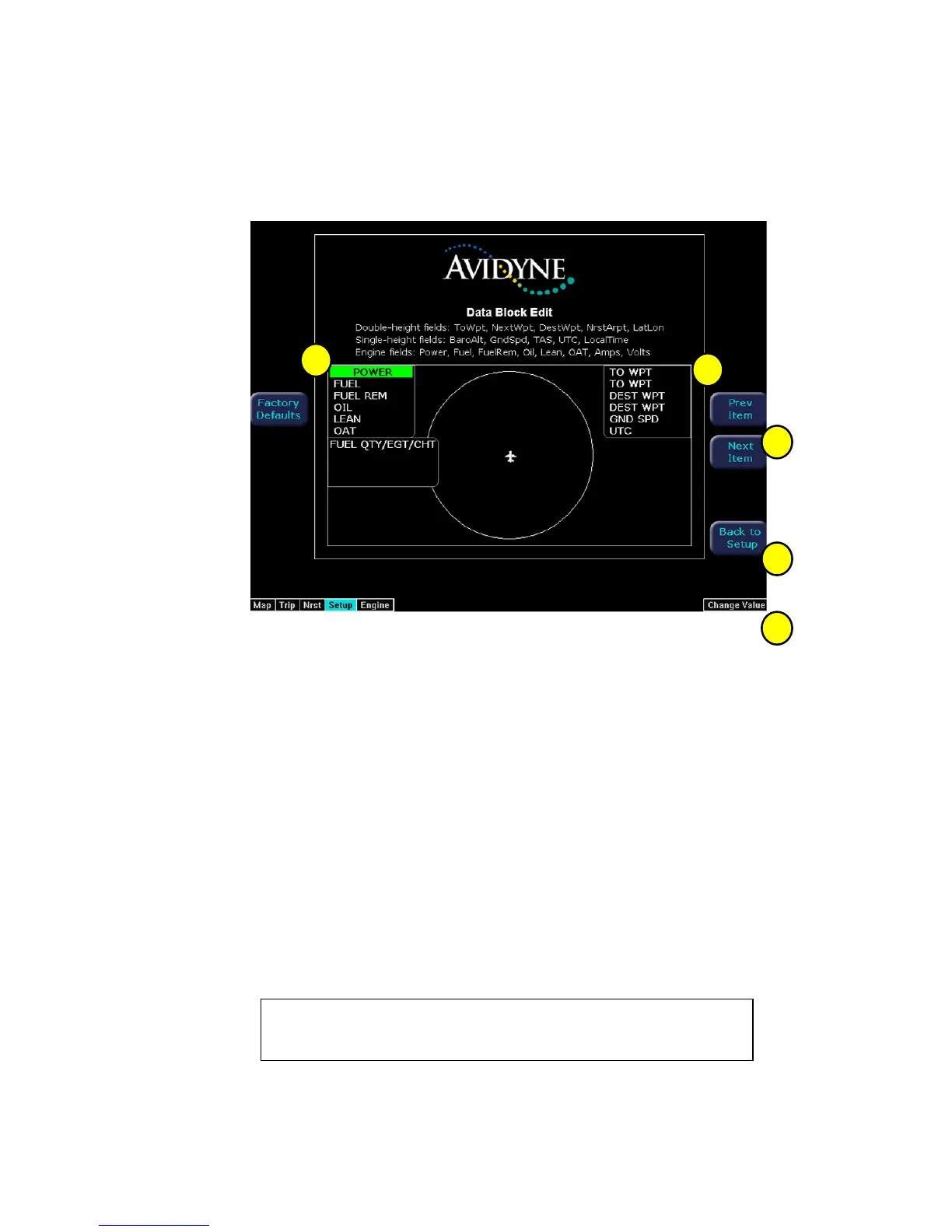 1) Left Data Block - Allows up to 6 lines of data for display and 4 slots for FUEL
