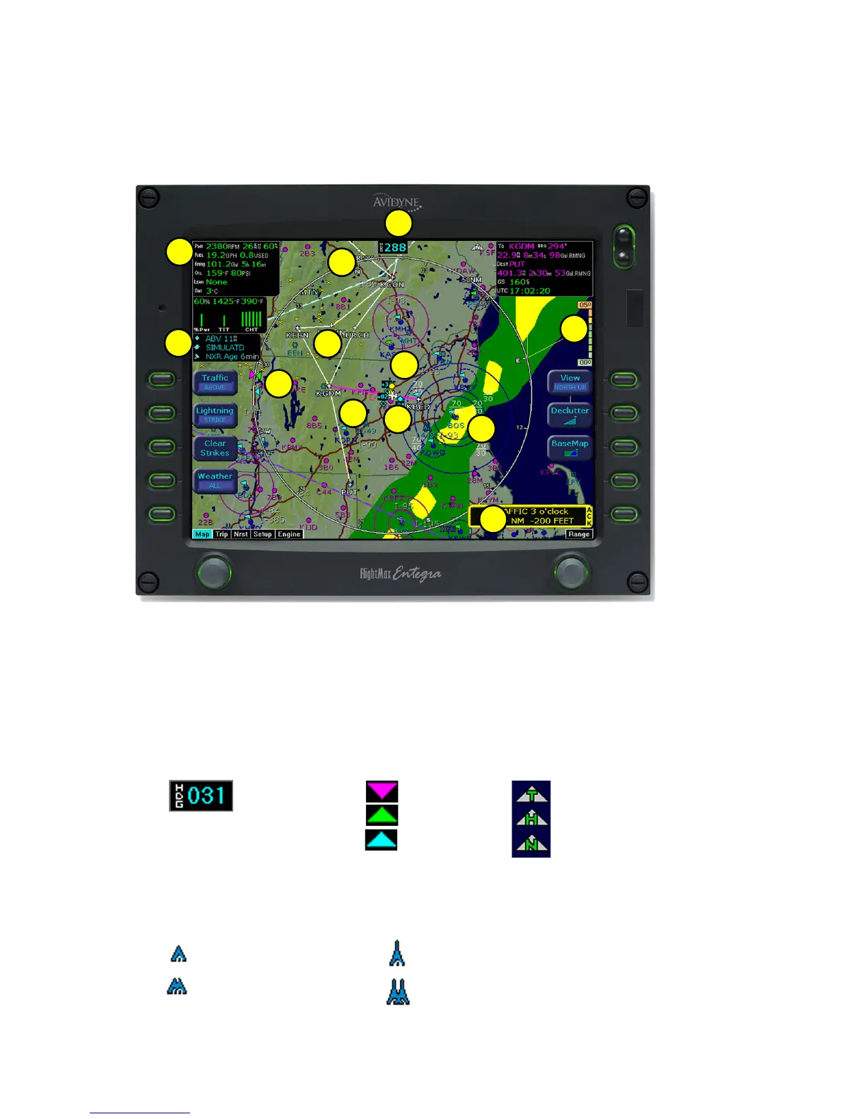 nearby airports, terrain, traffic, lightning, weather, special use airspace, and other