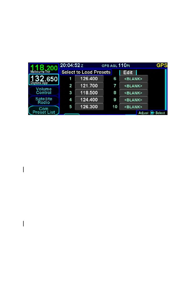 The “Com Preset List” LSK can be used to nominate one of up to