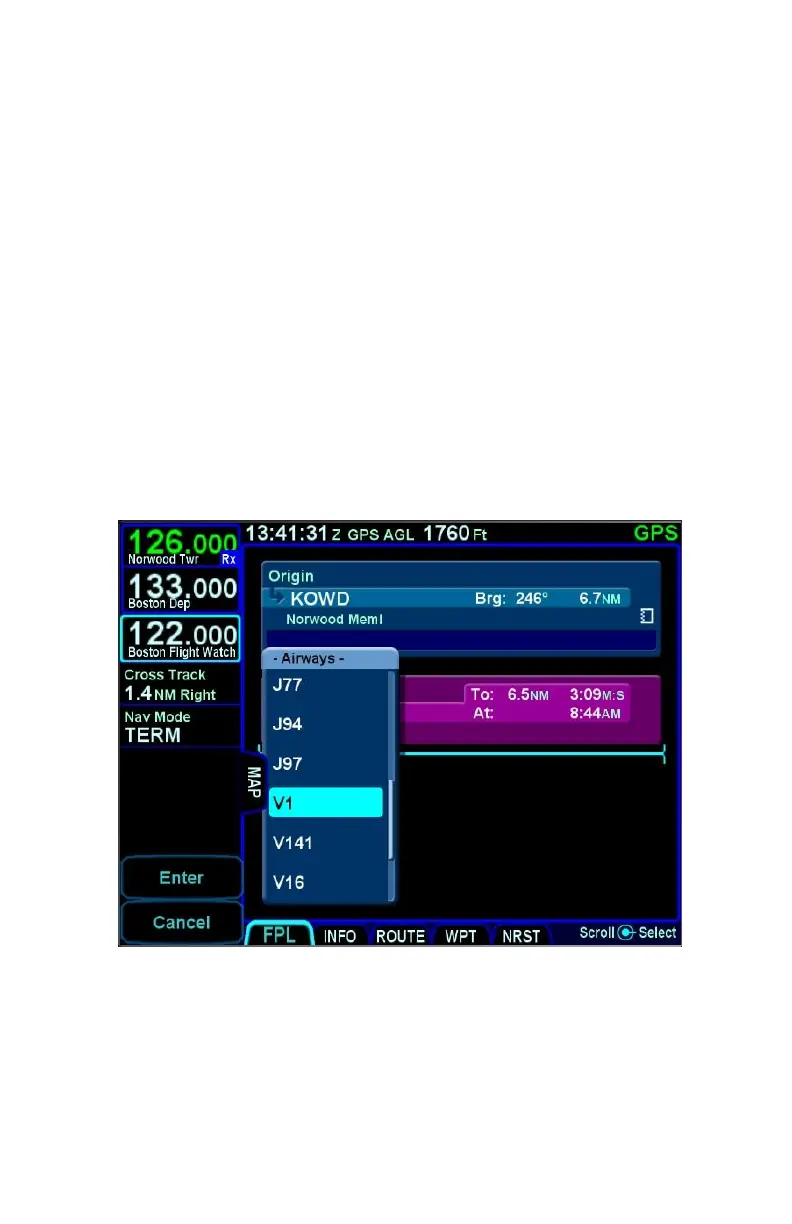 To insert an airway into the flight plan, move the cursor to a