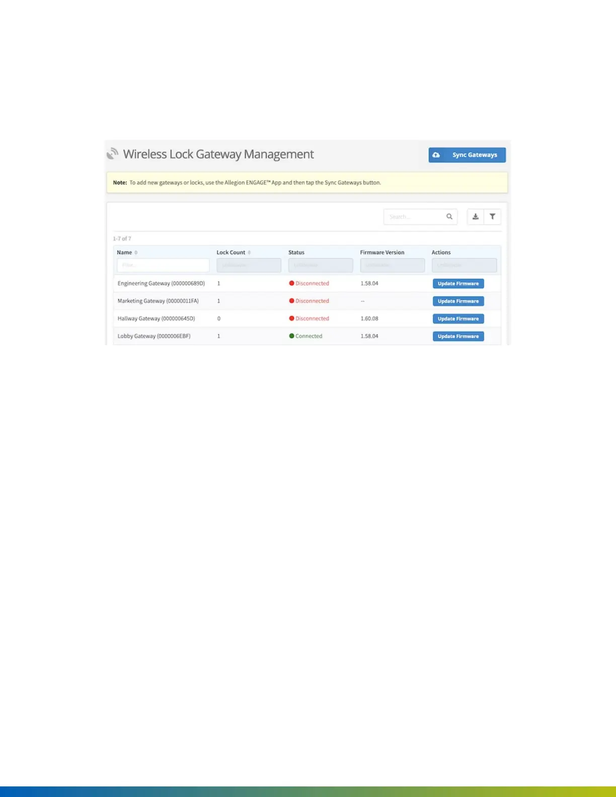TheWirelesslockgatewayspageprovidesthelistofgatewayssyncedusingtheAllegionENGAGE™app.From