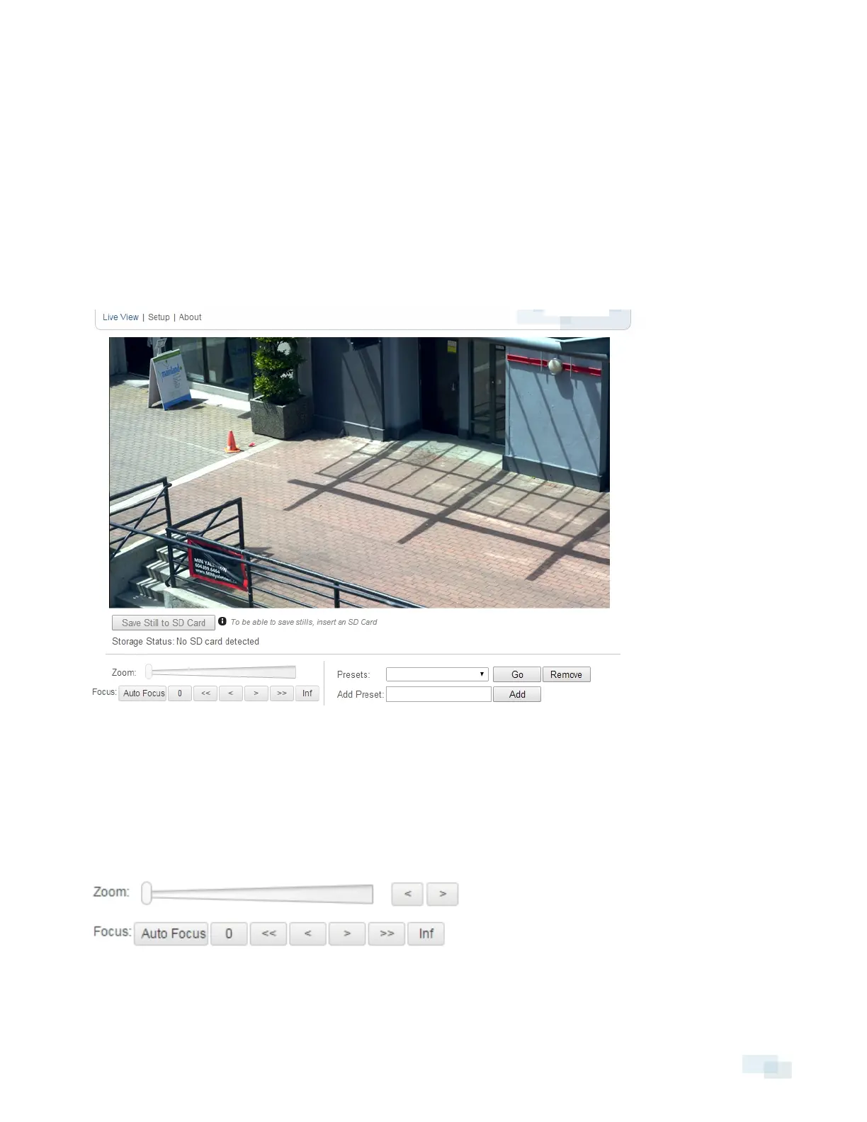 After you log in, the first page you see is the Live View. The Live View contains an image panel that displays the