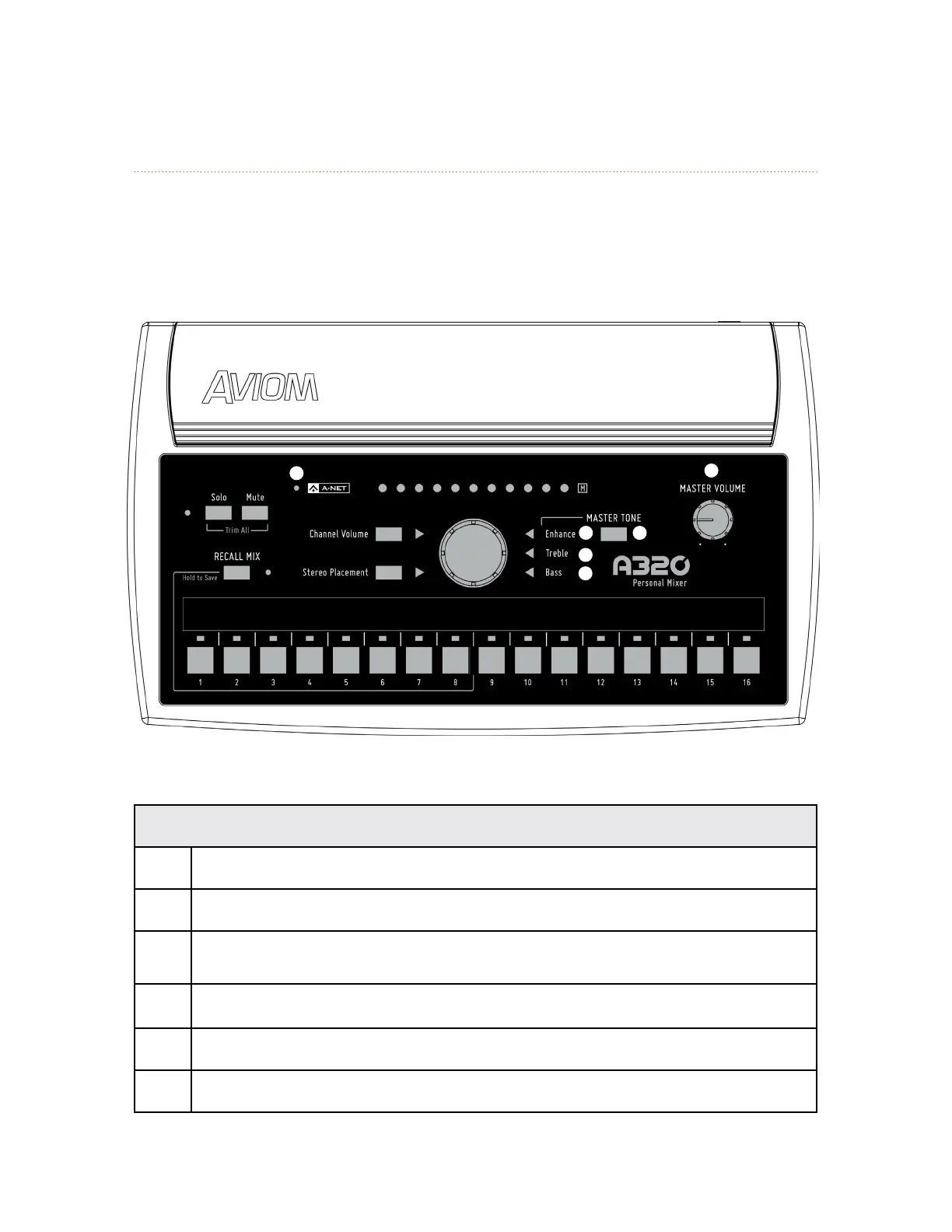 The master section of the A320 Personal Mixer’s interface includes the A-Net LED and the
