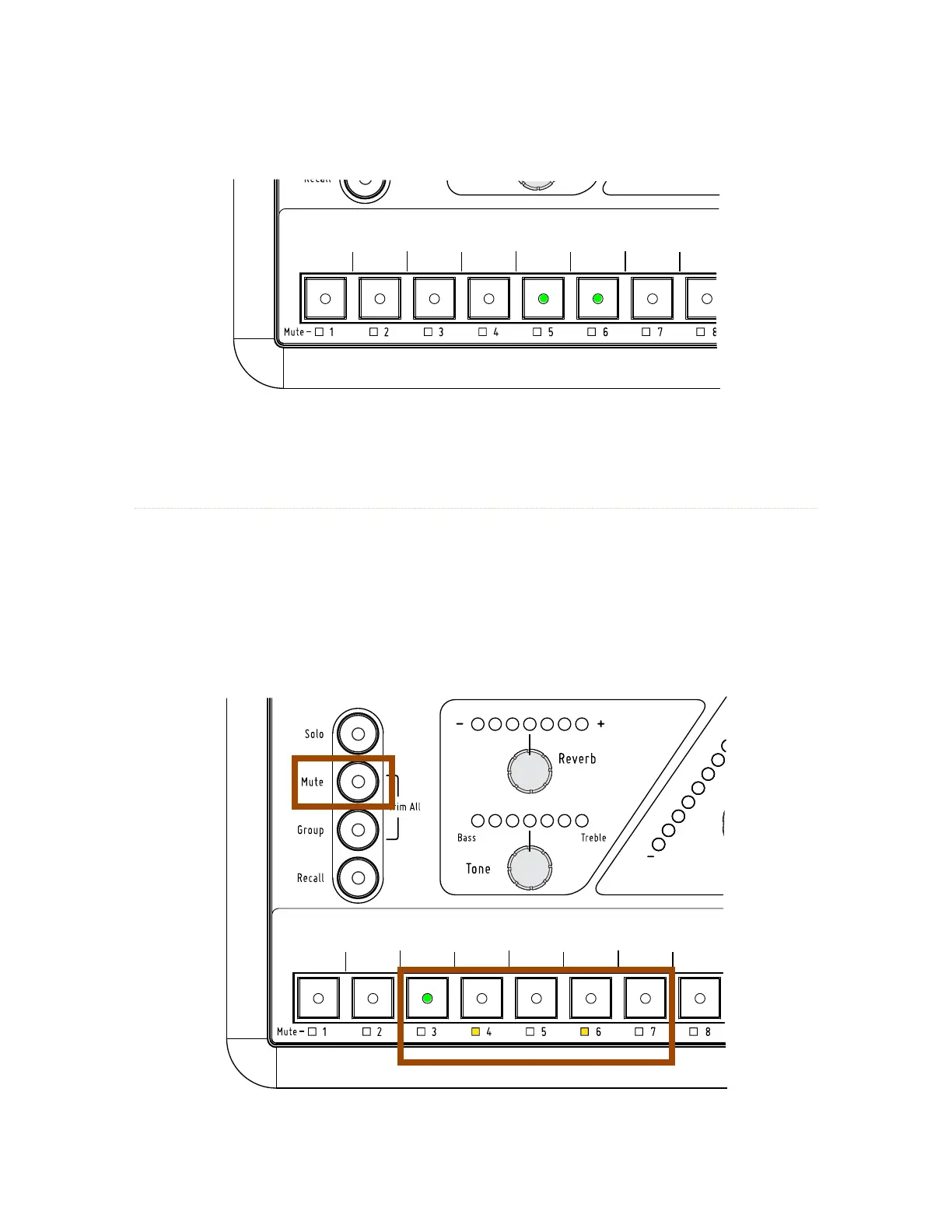 To unmute a channel, select the channel first (its green LED will light) and then press the mute button. The