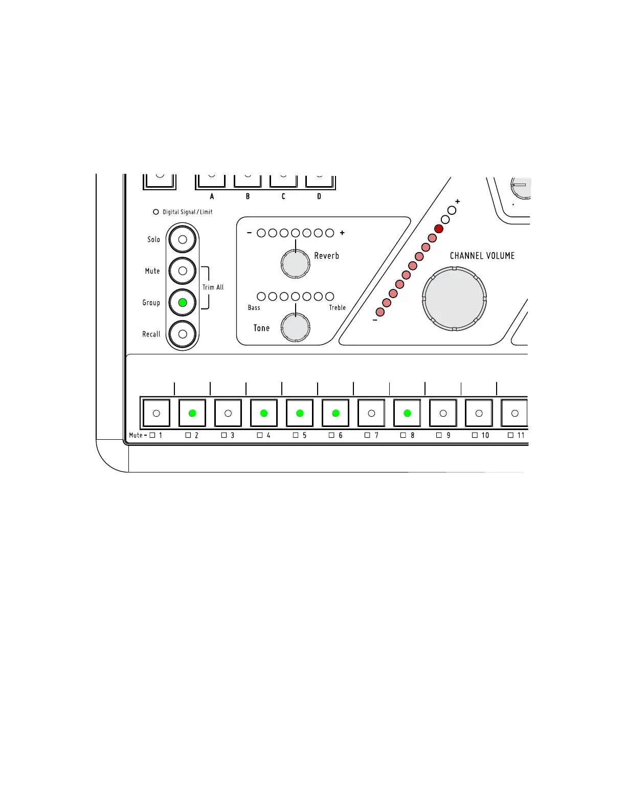 In this example, mix channels 2, 4, 5, 6, and 8 are grouped together. The Channel Volume knob controls the Group volume.