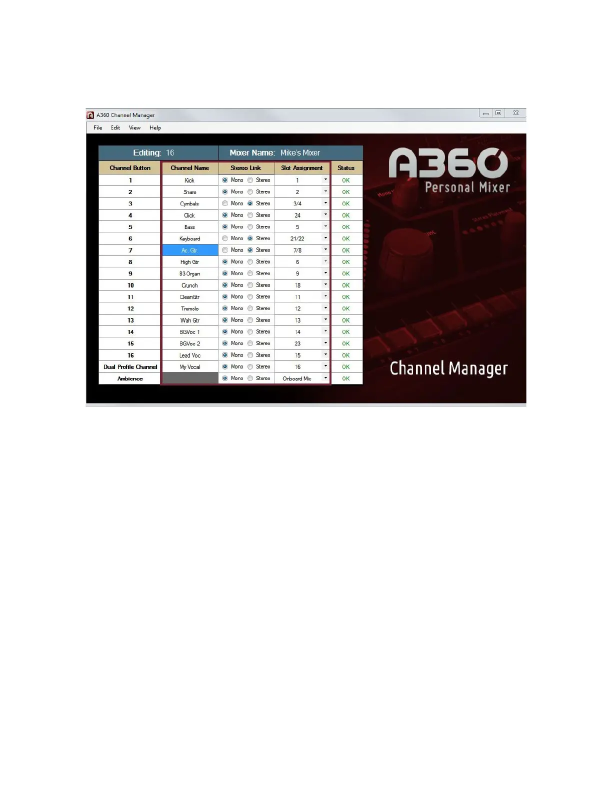 A custom channel conguration is shown in the A360 Channel Manager software.