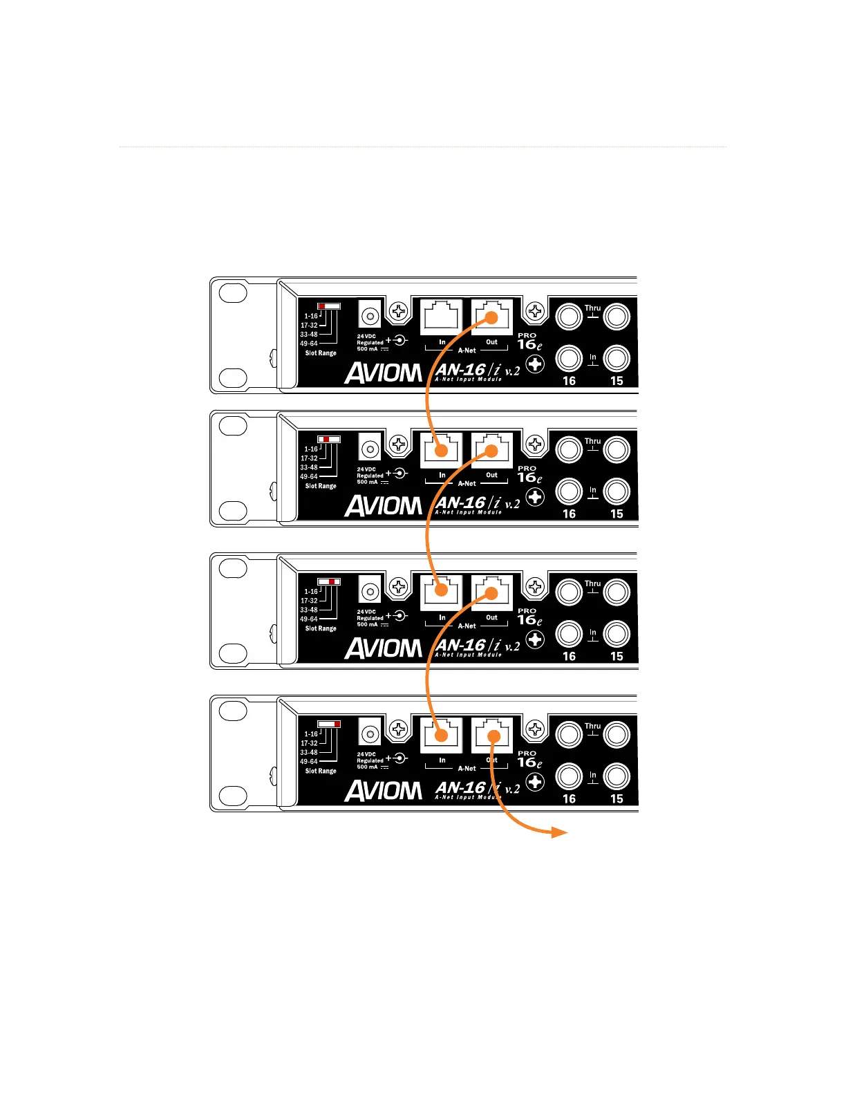 correct. Each input module is daisy chained, connecting a Cat-5 cable from its A-Ne t ou t to the A-Ne t IN of