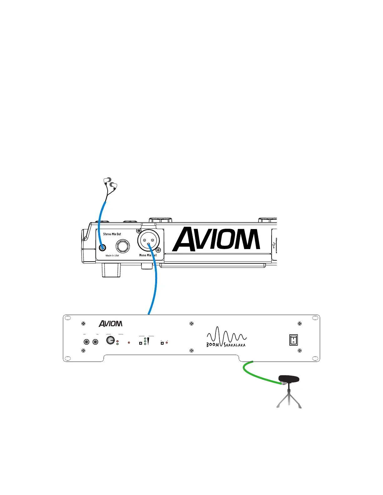 Connect earbuds or headphones to the Stereo Mix Out; connect an XLR cable from the Mono Mix