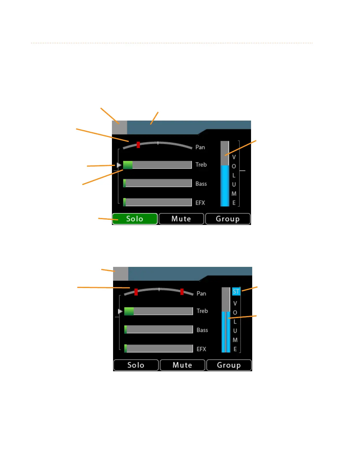 View will display the Solo, Mute on/o, Group, and Favorite channel status as needed.