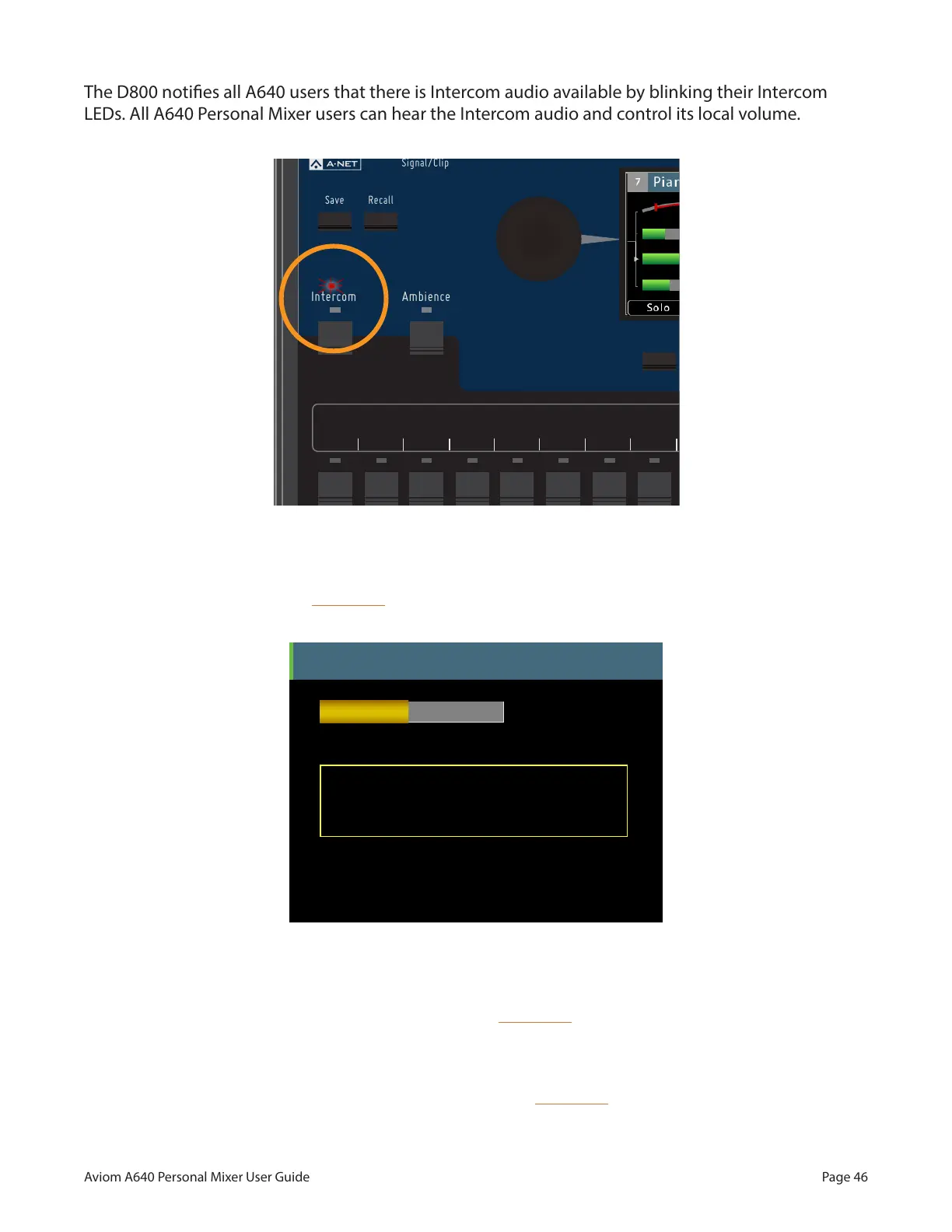 LEDs. All A640 Personal Mixer users can hear the Intercom audio and control its local volume.