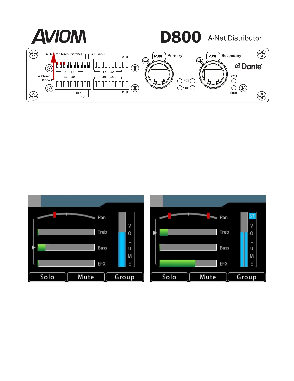 DIP switches set Stereo Links on the D800-Dante A-Net Distributor