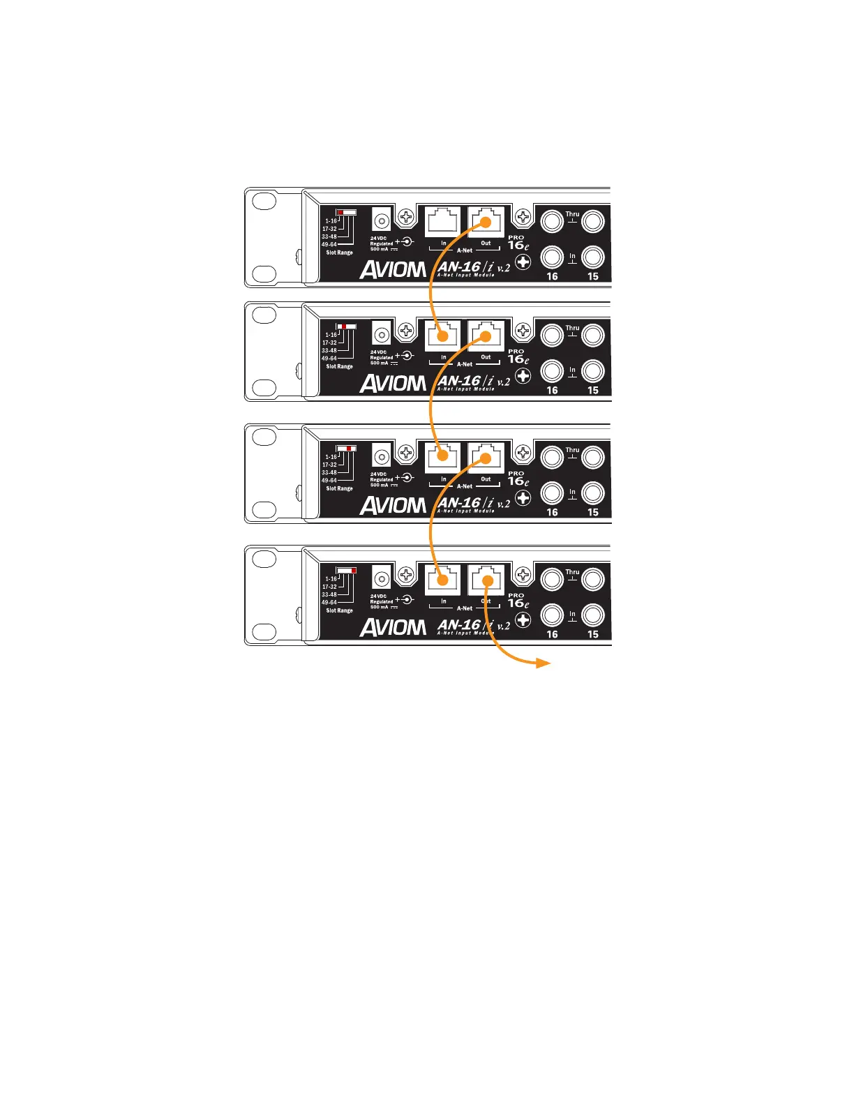 Each analog input module is daisy chained, connecting a Cat-5 cable from its A-Net Out port to the